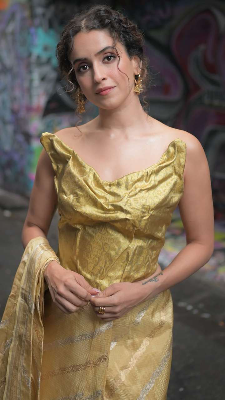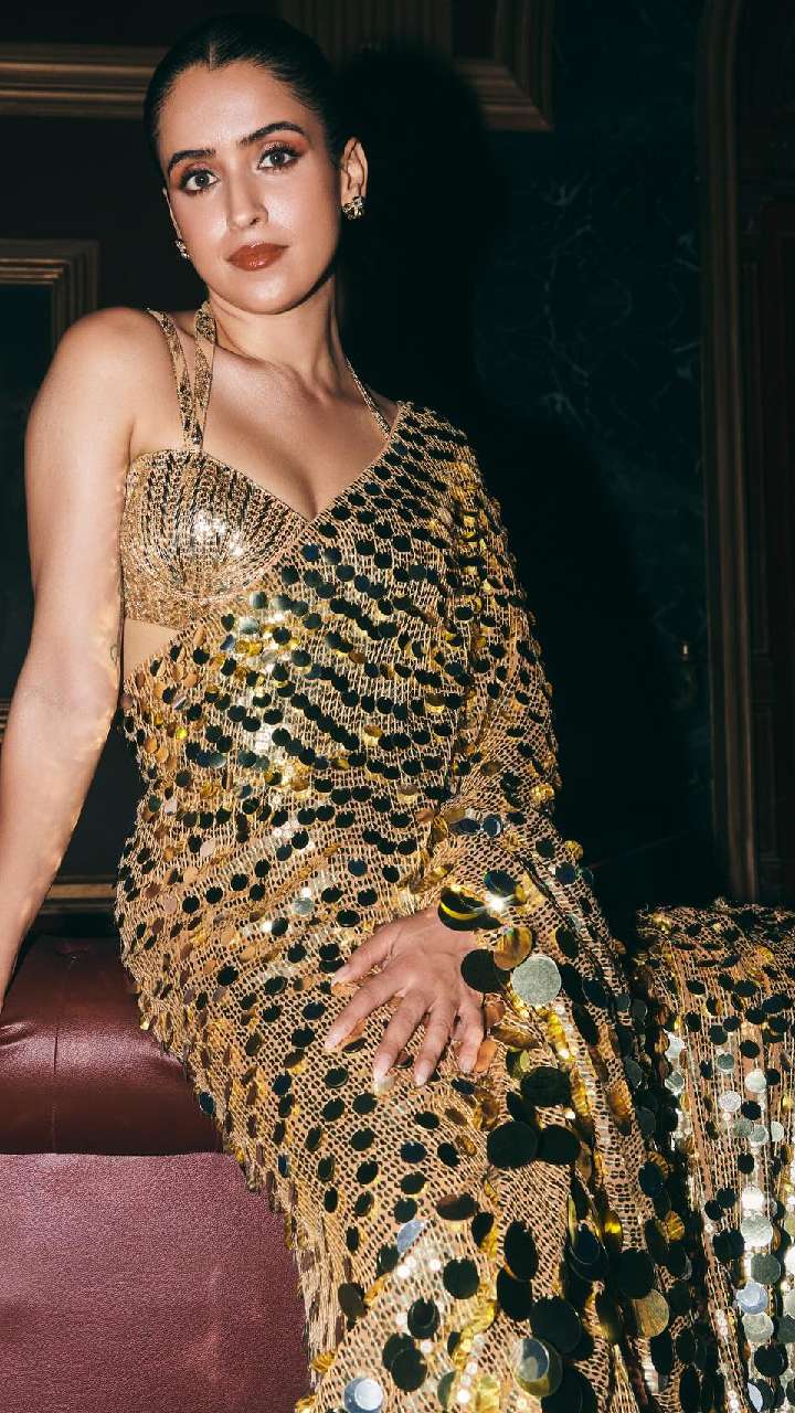 इस गोल्डन कलर की मिरर स्टाइलिश साड़ी में एक्ट्रेस का लुक बहुत ग्लैमरस लग रहा है। आप भी ऐसी साड़ी को डार्क न्यूड मेकअप के साथ पार्टी में पहन सकती हैं।