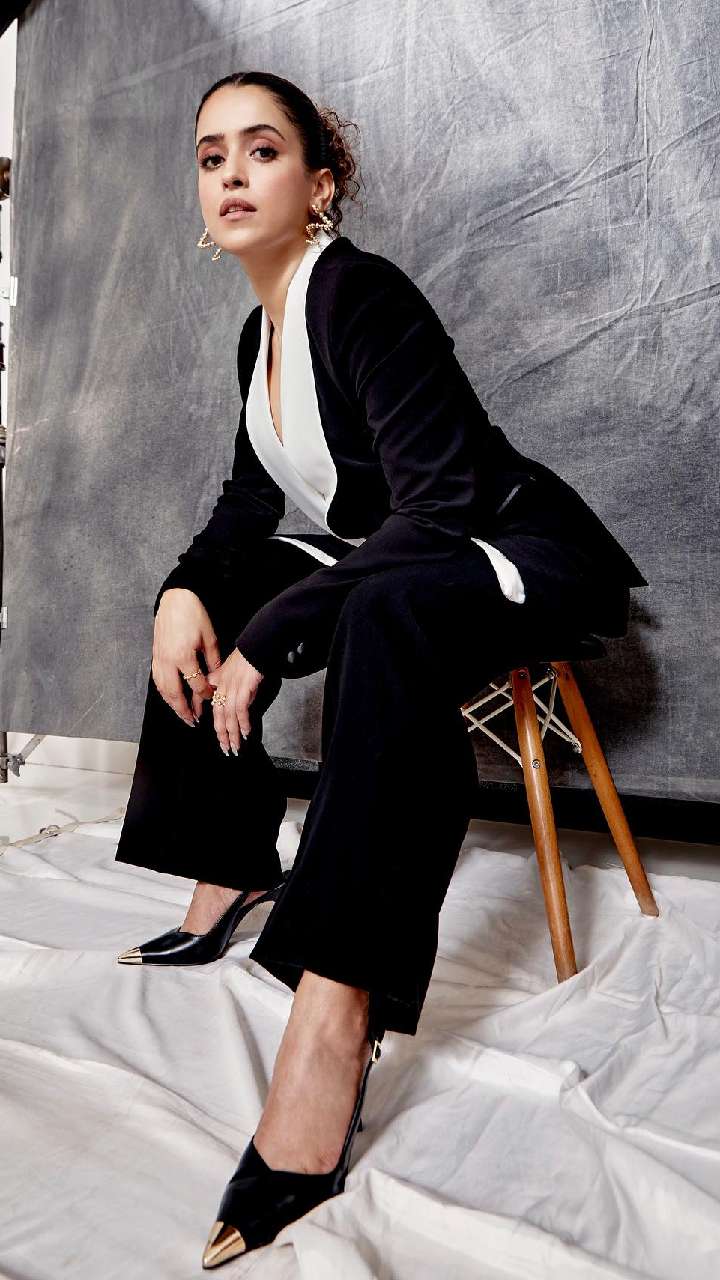 अगर आप ब्लैक लवर हैं तो आप सान्या के इस लुक को कैरी कर सकती हैं। ब्लैक सूट में एक्ट्रेस कमाल लग रहीं हैं।