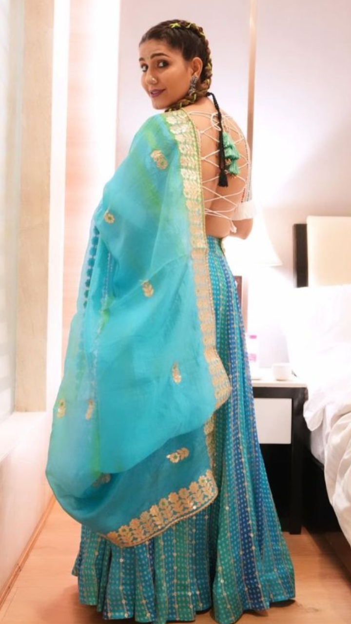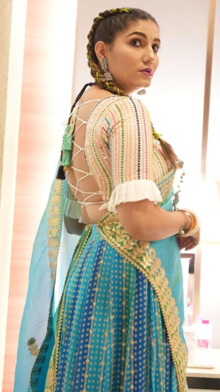 पूरे लुक की बात की जाए तो सपना ने लहंगे के साथ बैकलेस ब्लाउस कैरी किया हैं। साथ ही उन्होंने दो चोटी बनाई हैं।