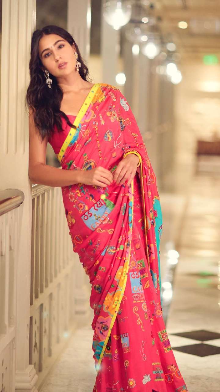 सारा इस ब्लैक और ब्लू शेड वाली साड़ी शिमरी नूडल स्ट्रैप ब्लाउज में बेहद हॉट लग रही हैं। यंग गर्ल्स इसे कॉपी कर सकती हैं।