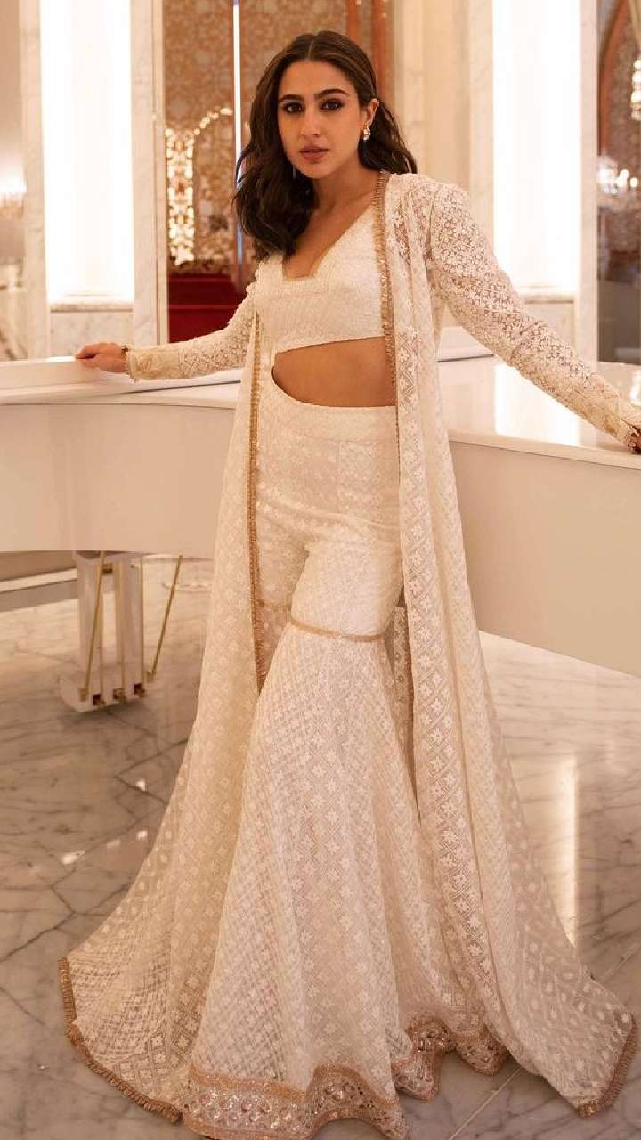 इन दिनों शरारा सूट और ड्रेस काफी ट्रेंड में हैं। ऐसे में सारा का ये व्हाइट लुक बेस्ट है।