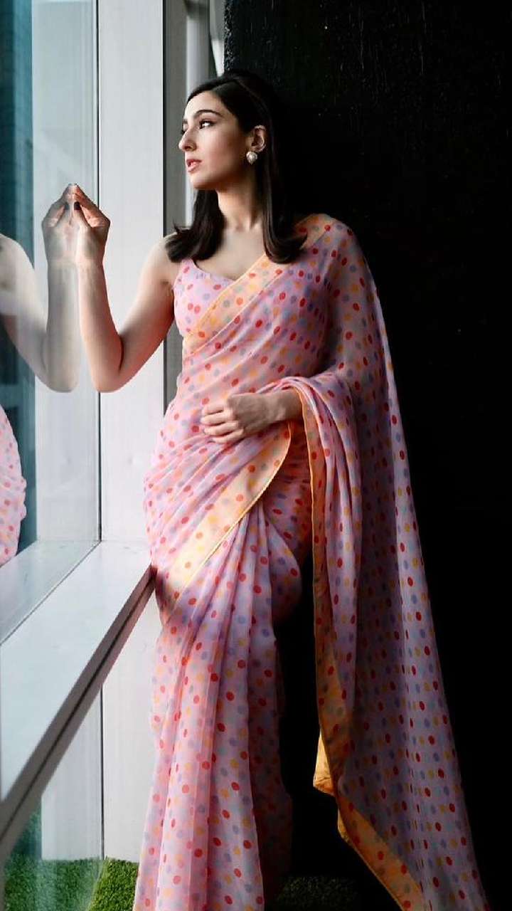 पिंक कलर की साड़ी में मल्टी कलर डॉट बने हुए हैं। आप भी सारा अली खान की तरह ही डॉट साड़ी कैरी कर सकती हैं।