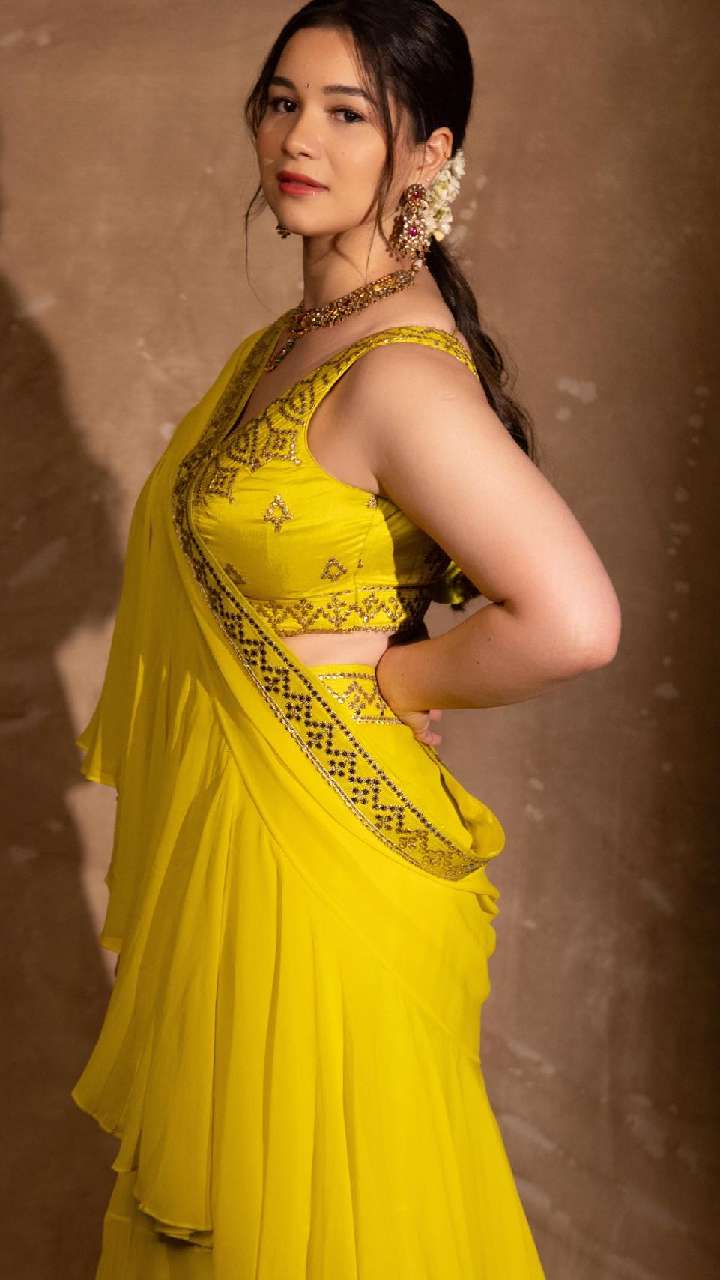 अगर आप अपने लुक को ट्रेंडी बनाना चाहती हैं तो आप सारा की तरह ही येलो रफस साड़ी स्टाइल कर सकती हैं।