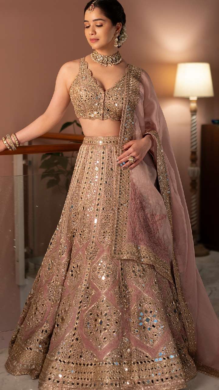 यंग गर्ल्स घर की शादी में मिरर वर्क लहंगा को चुन सकती हैं। ऐसा लहंगा के साथ गोल्डन ज्वेलरी और गजरा बन लुक को खूबसूरत बना देगा।