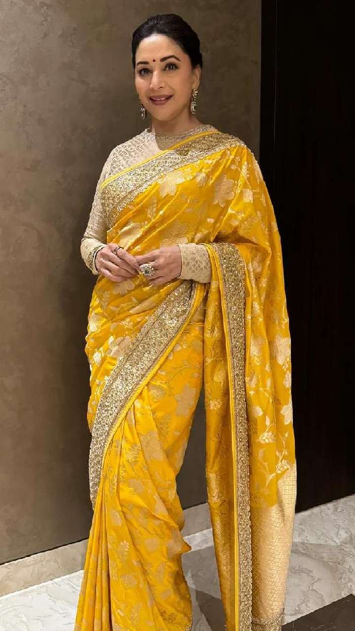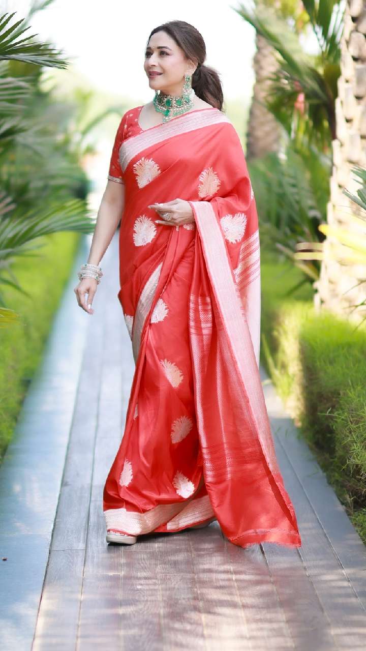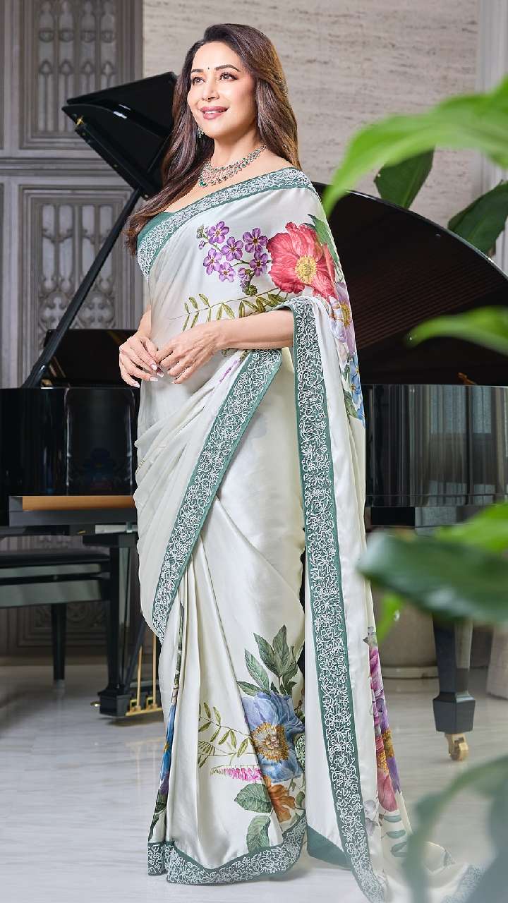 व्हाइट कलर की प्रिंटेड साड़ी में माधुरी बेहद खूबसूरत लग रही हैं। आजकल ऐसी साड़ियां काफी ट्रेंड कर रही है। सिंपल के साथ डिसेंट लुक के लिए आप साड़ी को पहन सकती हैं।