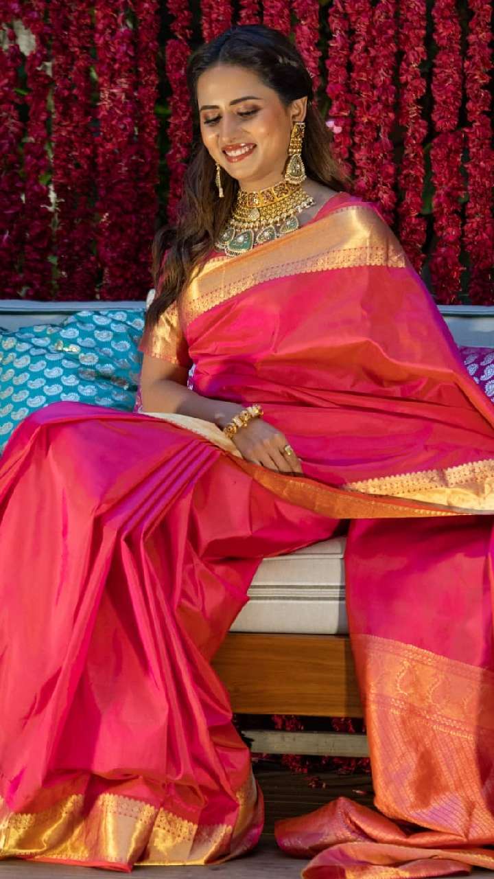अगर आप सिल्क साड़ी पहनने के शौकीन हैं, तो एक्ट्रेस की इस साड़ी से आइडिया ले सकती हैं। पिंक कलर की गोल्डन बॉर्डर साड़ी में एक्ट्रेस रॉयल लुक दे रही हैं।