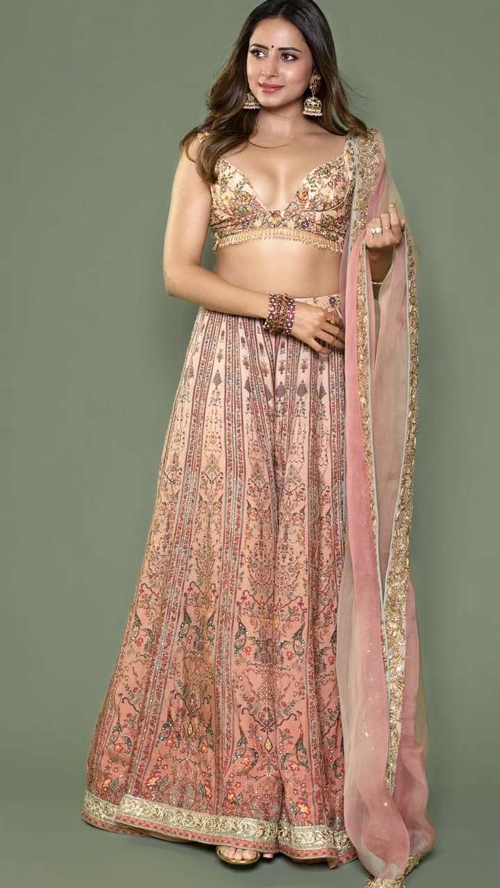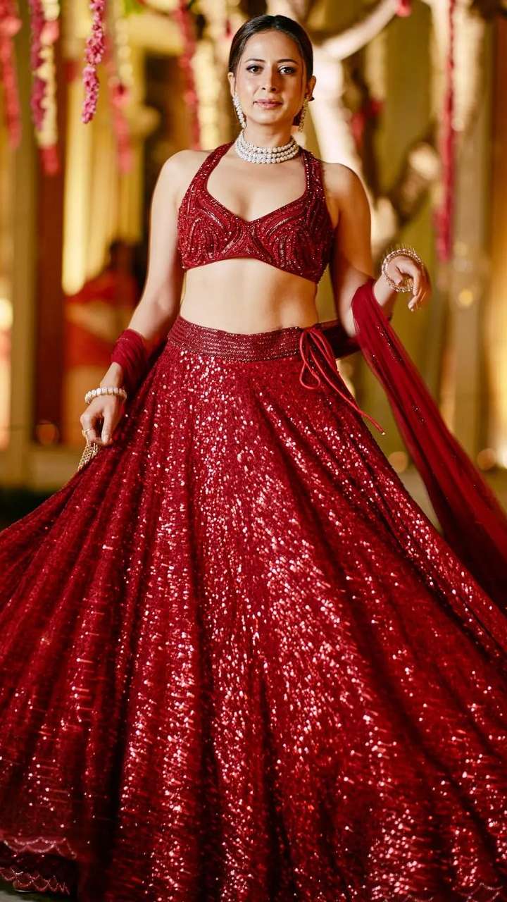 एक्ट्रेस का हर आउटफिट डिजाइनर होता है, ये रेड कलर का लहंगा भी डिजाइनर है। ये लुक काफी स्टाइलिश है।