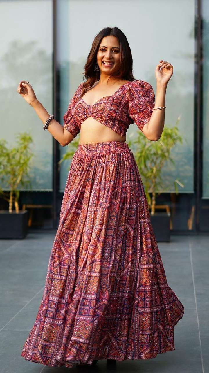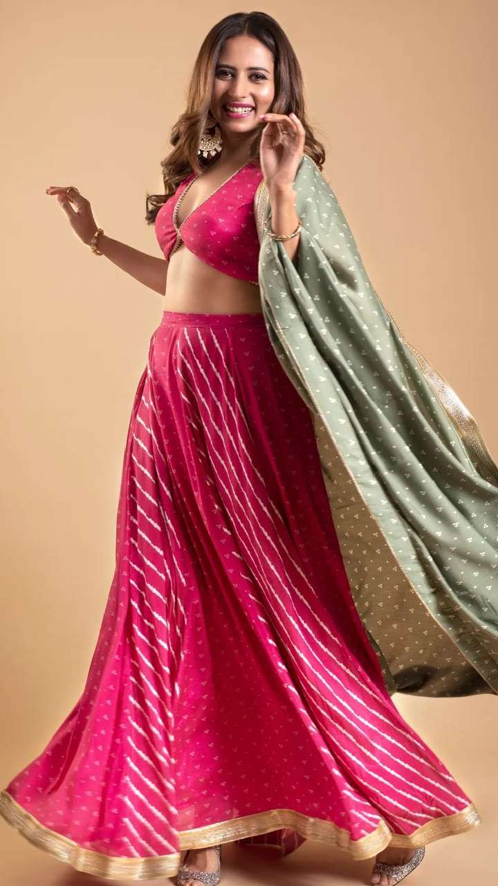 सरगुन मेहता इस लहंगे में हुस्न की मलिका लग रहीं हैं। लहंगे के साथ उन्होंने डीप नेक चोली कैरी की है जिसकी स्लीव्स बैलून पैटर्न की हैं।