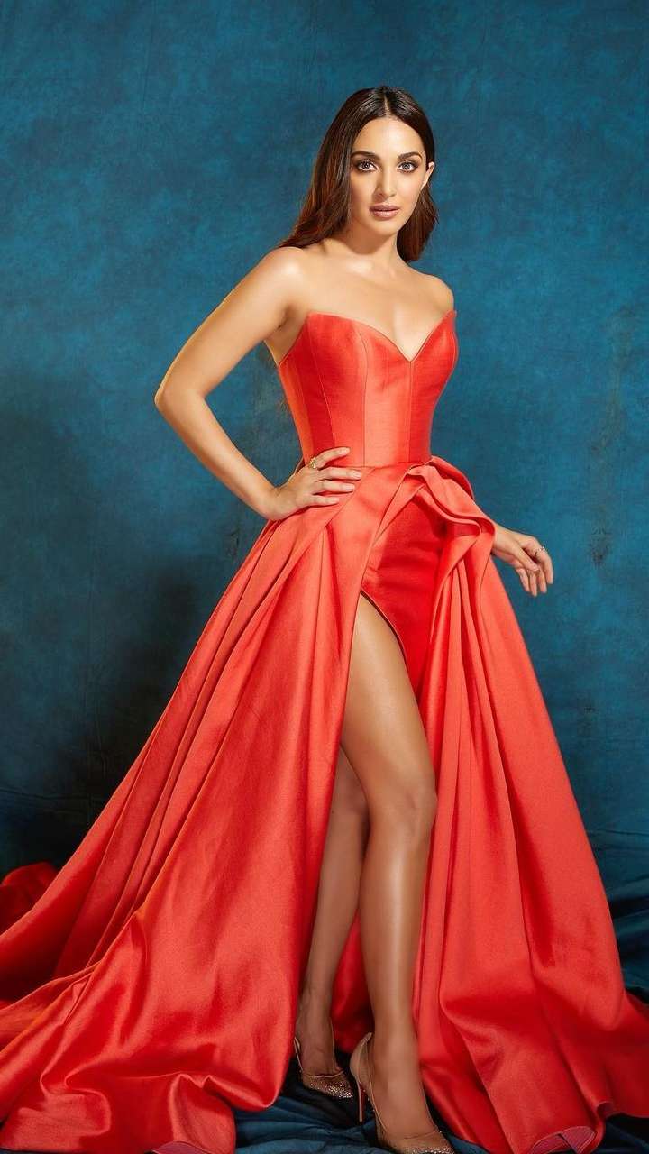 रेड कलर की ऑफ शोल्डर हाई-थाई स्लिट ड्रेस में कियारा आडवाणी काफी सुंदर लग रहीं हैं।