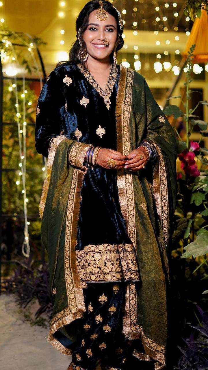 अपनी कव्वाली नाईट में स्वरा डार्क ब्लू कलर के वेलवेट सूट में बला की खूबसूरत लग रही थीं।