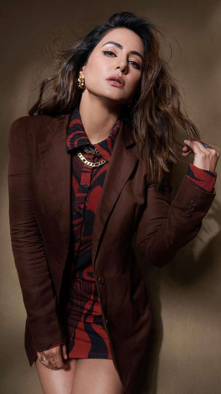 एक्ट्रेस अपने इस ड्रेस में बेहद बोल्ड और ग्लैमरस लग रही है। मेसी हेयर स्टाइल और मिनिमल मेकअप में हिना काफी गॉर्जियस लग रही हैं।