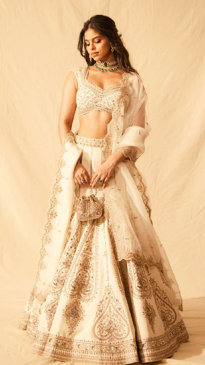 सुहाना खान ने डायमंड नेकलेस के साथ एंब्रॉयडरी वर्क लहंगा कैरी किया है, जिसमें वह प्रिंसेस से कम नहीं लग रही हैं।