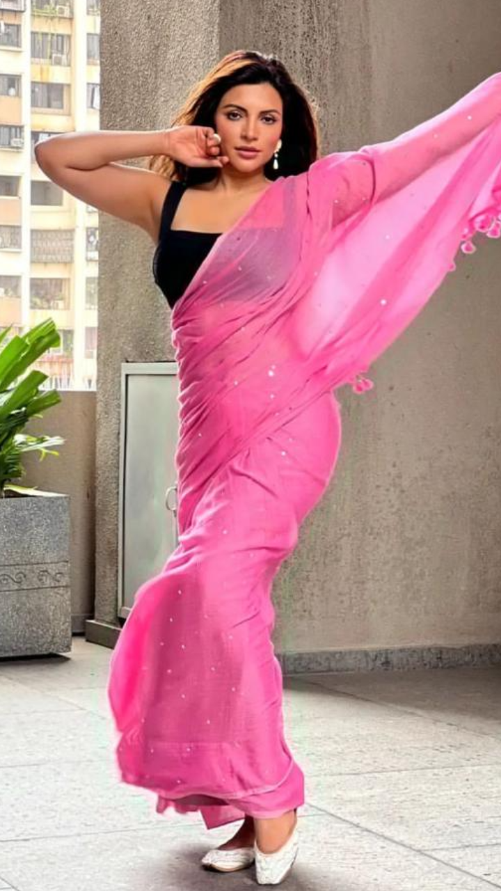 पिंक साड़ी और ब्लैक ब्लाउज में शमा का बोल्ड अंदाज सभी को बहुत पसंद आया।