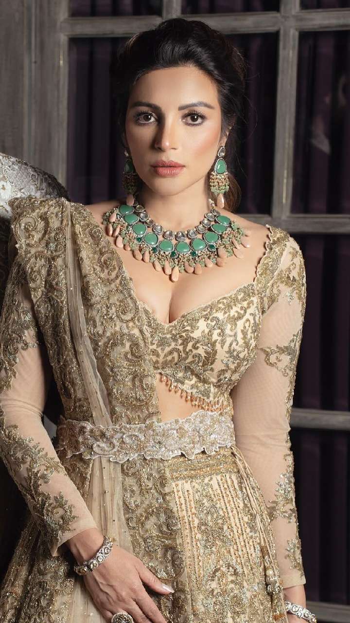 अभिनेत्री का गोल्डन हेवी वर्क लहंगा आप वेडिंग फंक्शन के लिए बेस्ट रहेगा। साथ में उन्होंने कंट्रास्ट ग्रीन स्टोन ज्वैलरी कैरी की है।