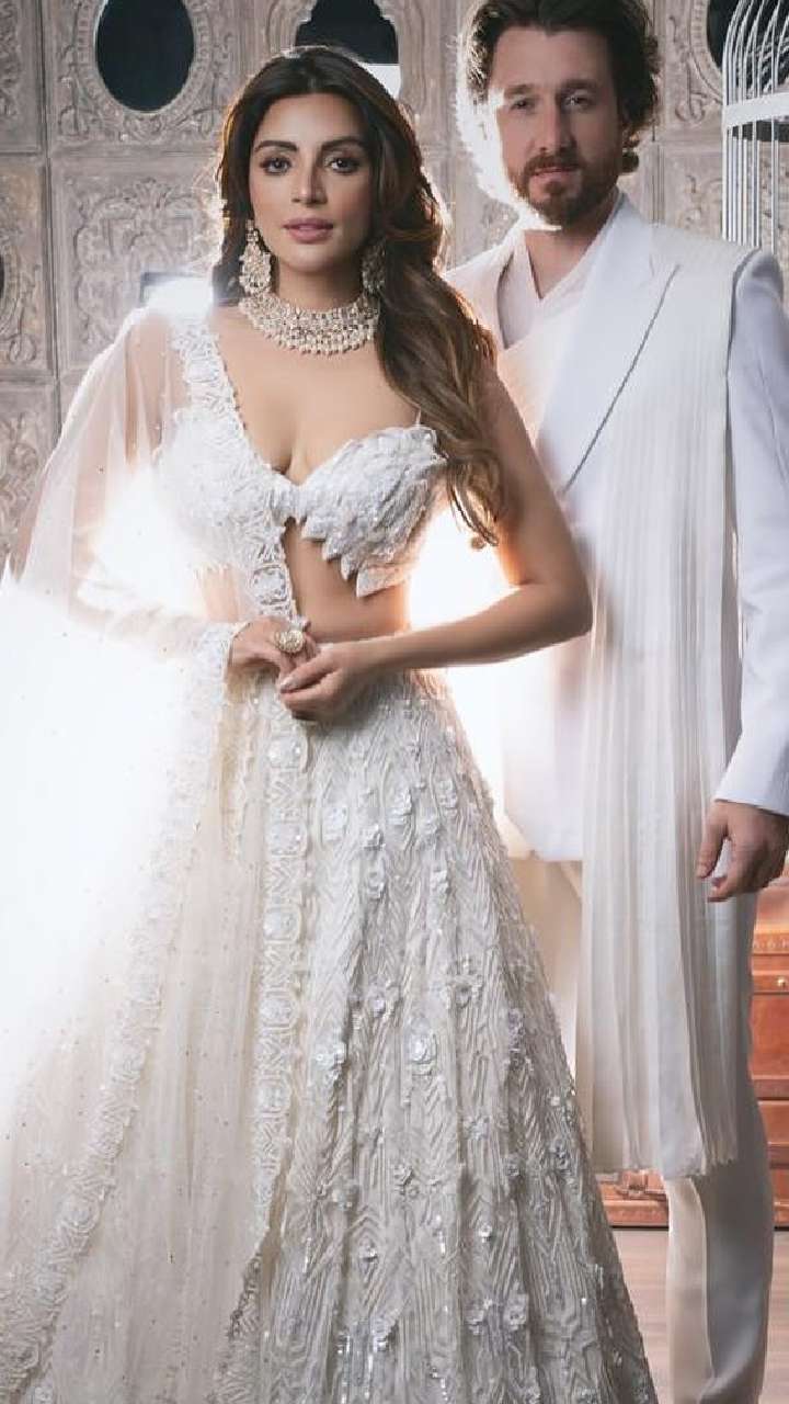 शमा का ऑल व्हाइट लहंगा आप रिसेप्शन या संगीत सेरेमनी किसी में भी वियर कर सकती हैं। साथ में उनकी बिकिनी कट चोली कहर ढहा रही है।