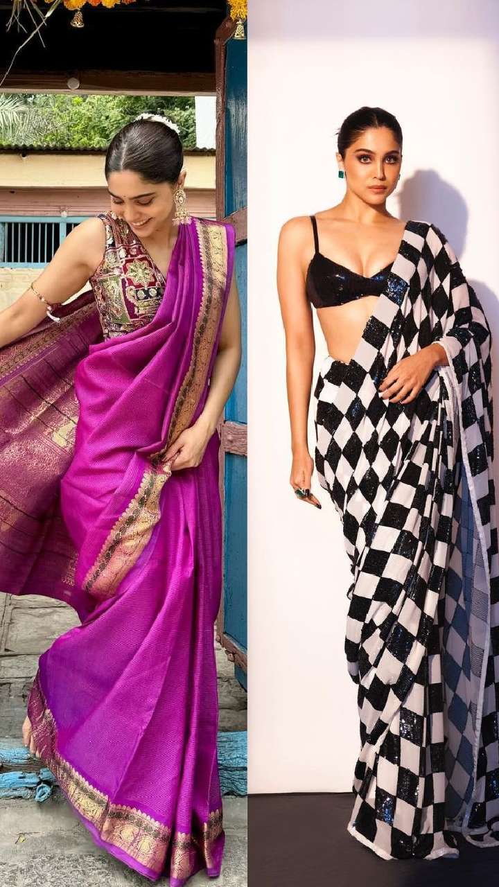 ब्लैक और व्हाइट कलर की चैक साड़ी में एक्ट्रेस का ये लुक काफी हॉट लग रहा है। आप इस तरह की साड़ी को पार्टी में कैरी कर सकती हैं।