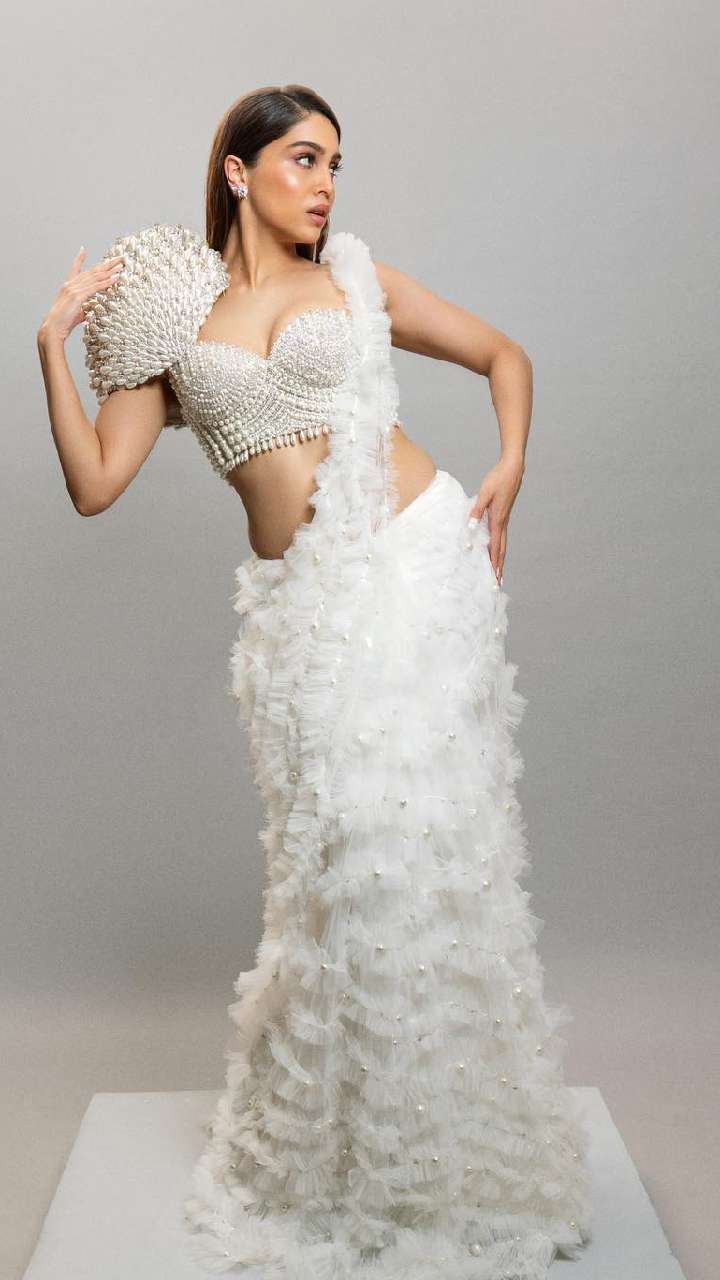 व्हाइट कलर की फ्रिल साड़ी काफी ज्यादा ट्रेंड में चल रही है। आप एक्ट्रेस की तरह ही फ्रील साड़ी के साथ पर्ल वर्क ब्लाउज पेयर कर सकती हैं।