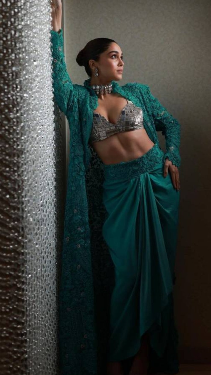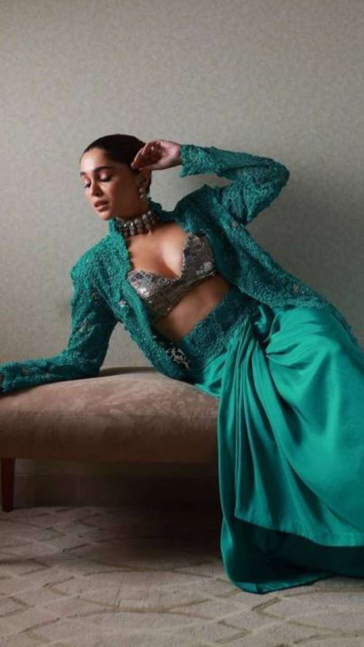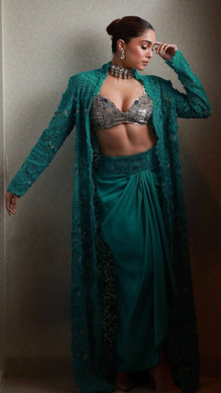 एक्ट्रेस ने पिकॉक ग्रीन और सिल्वर कलर की ड्रेस कैरी की हुई हैं और साथ में सिल्वर ज्वैलरी भी पहनी है।