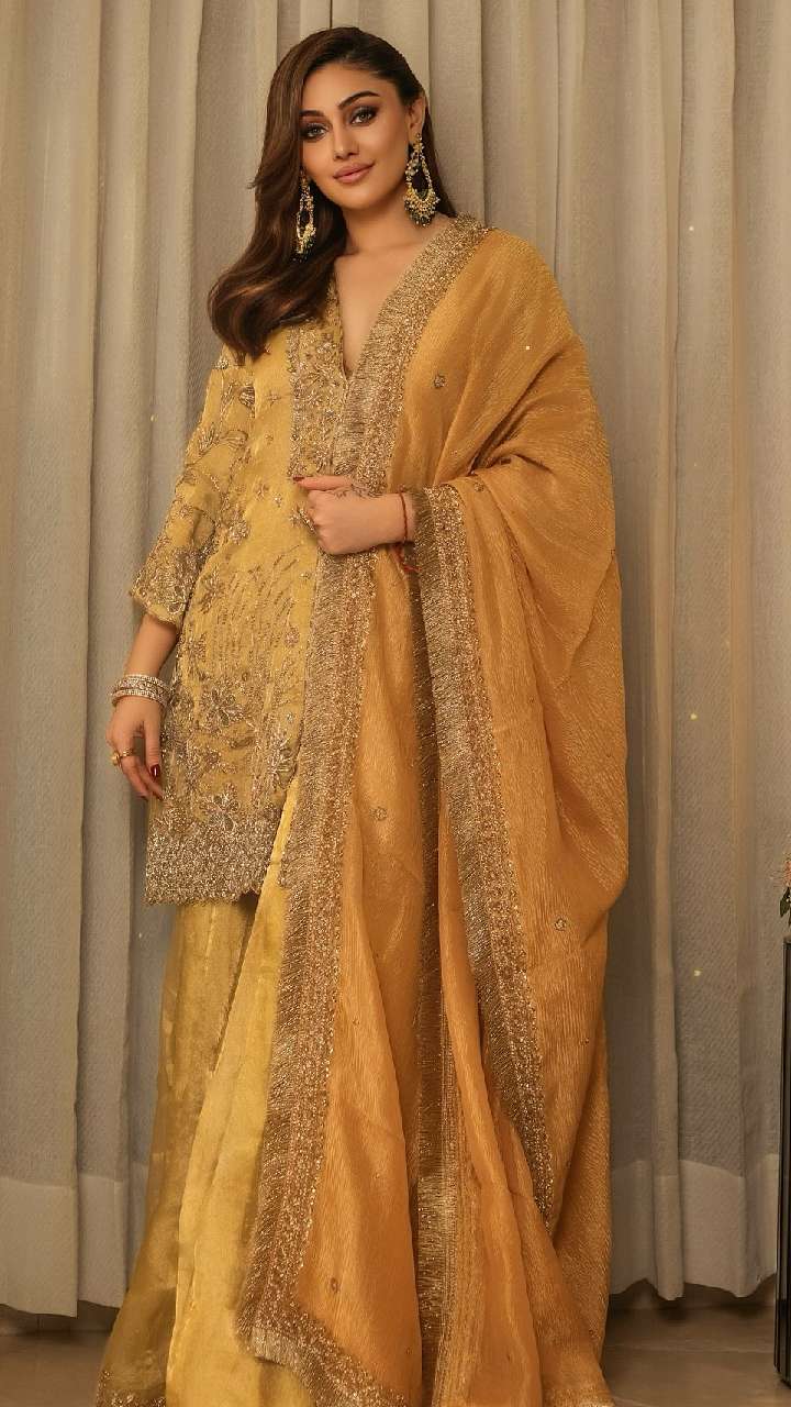 एक्ट्रेस मस्टर्ड येलो कलर के जरी वर्क शरारा सूट में बहुत प्यारी लग रही हैं। ऐसे सूट शादी-फंक्शन के लिए बेस्ट है। आप इन सूट के साथ हैवी इयररिंग्स कैरी कर सकती हैं।