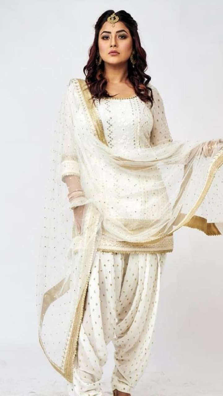 शहनाज इस व्हाइट कलर के गोल्डन वर्क पटियाला सूट में एकदम पंजाबी कुड़ी लुक दे रही हैं।