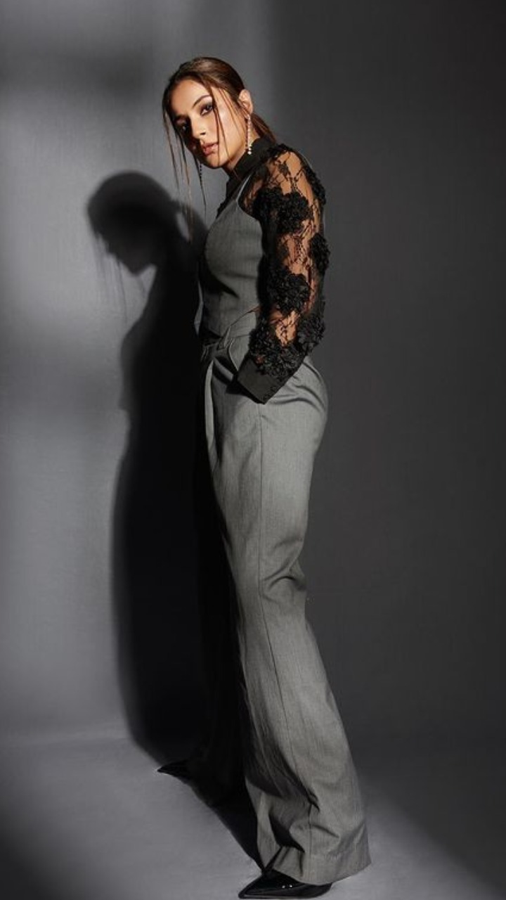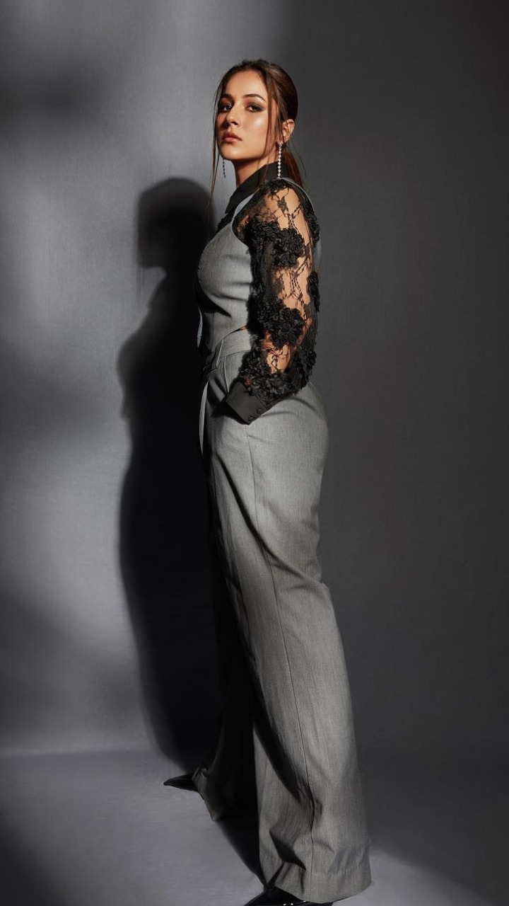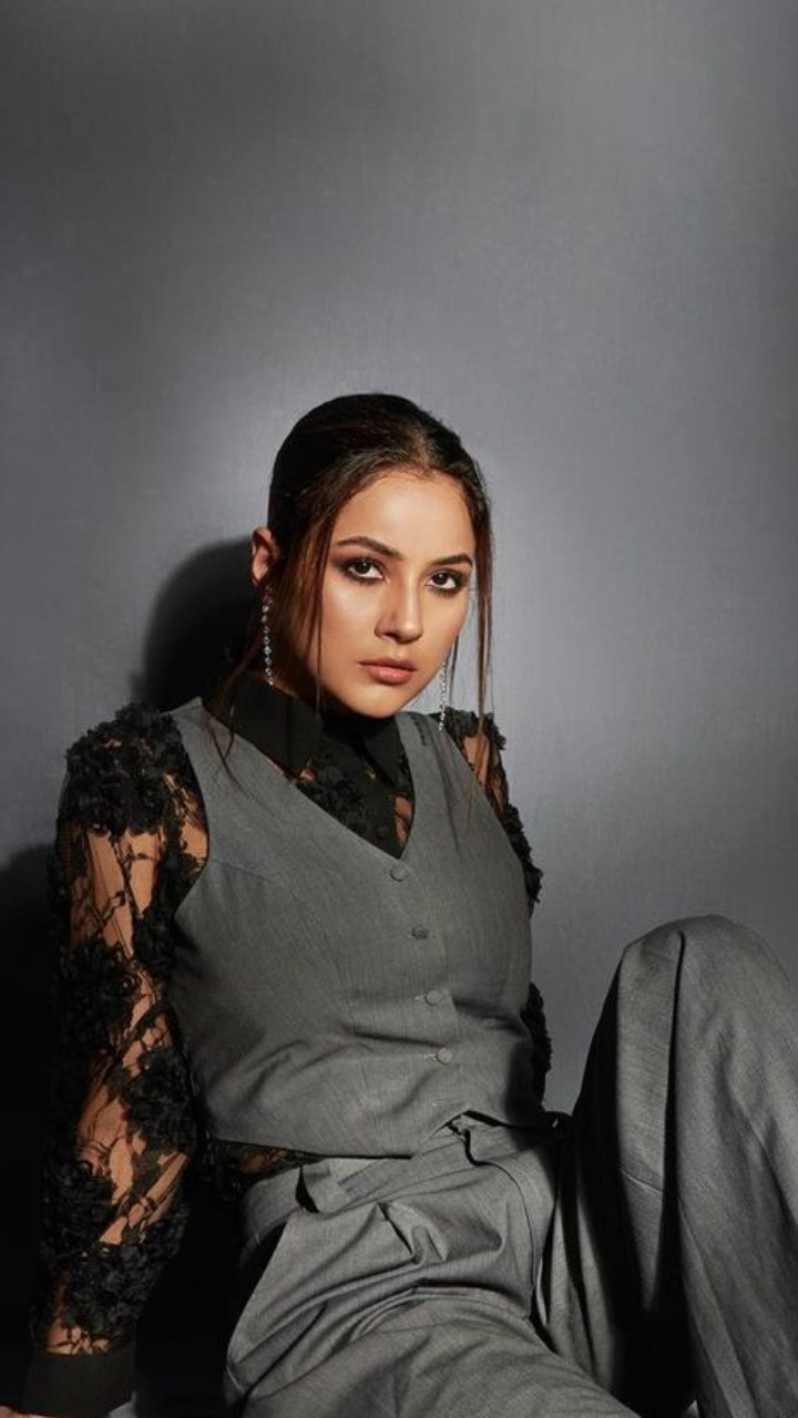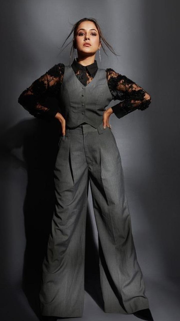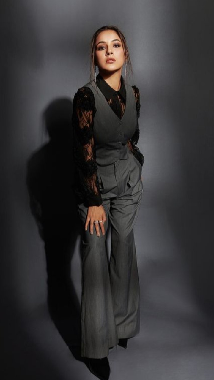 शहनाज ने ब्लैक कलर का नेट टॉप पहना है और उसके साथ ग्रे फॉर्मल सूट पहना है। साथ ही बैली से पूरे लुक को कम्पलीट किया है।