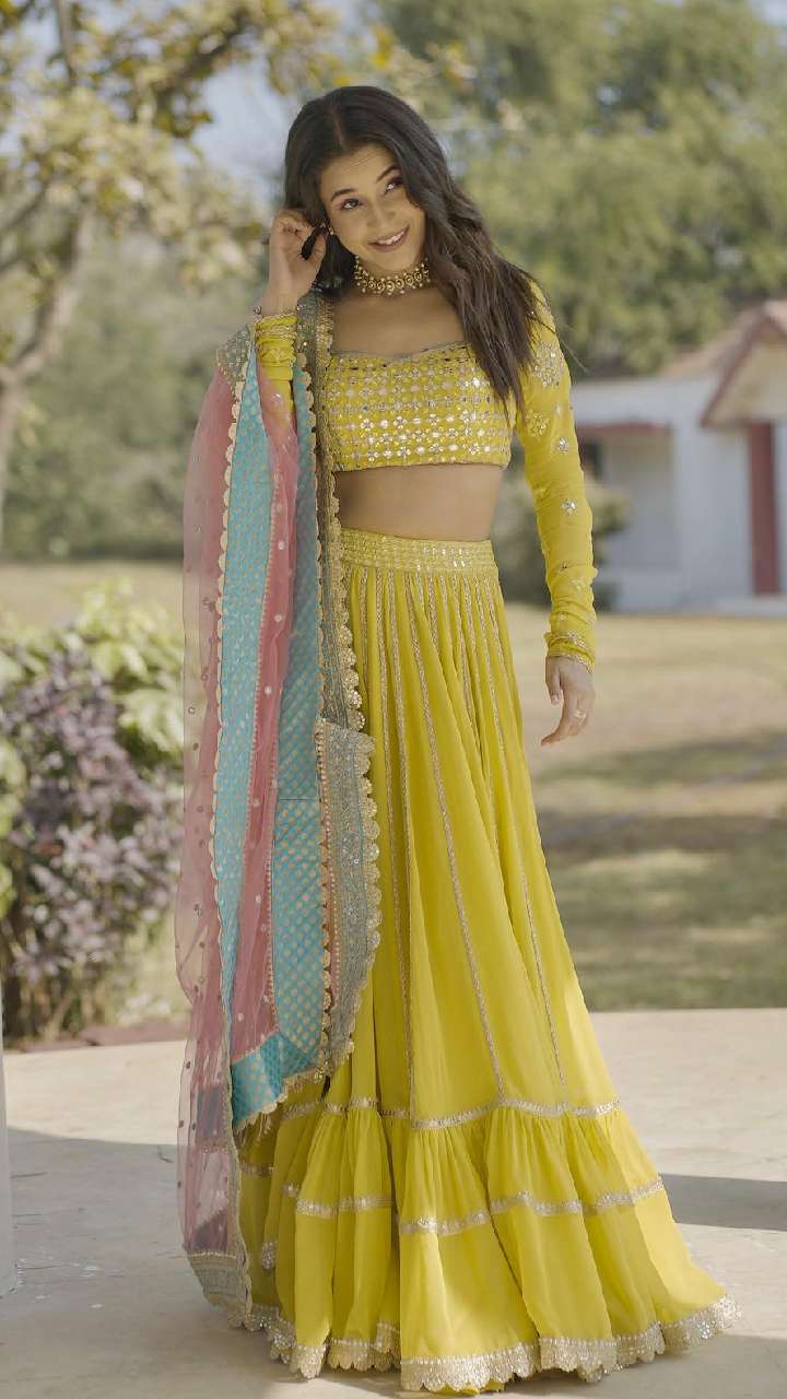 शहनाज गिल इस येलो कलर के लहंगा में बेहद खूबसूरत लग रही हैं। वहीं, पिंक कलर का दुपट्टा उनको डिसेंट लुक दे रहा है। आप भी इस तरीके का लहंगा ट्राई कर सकती हैं।