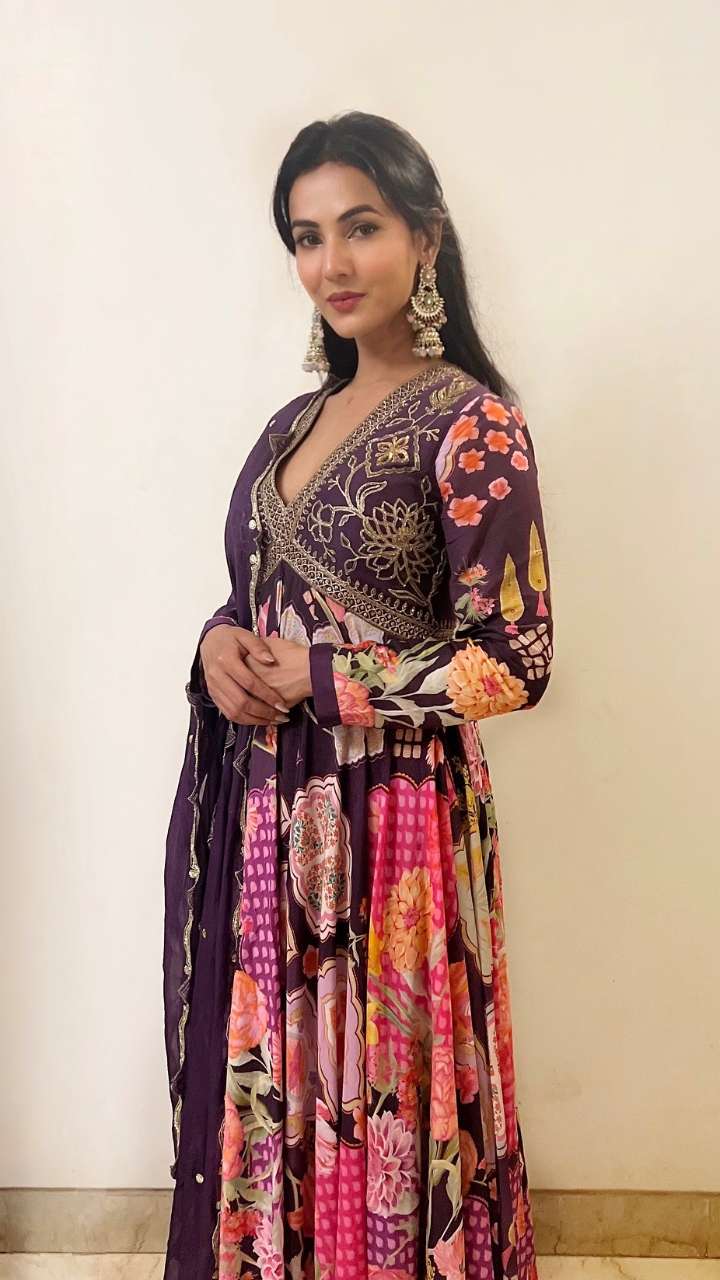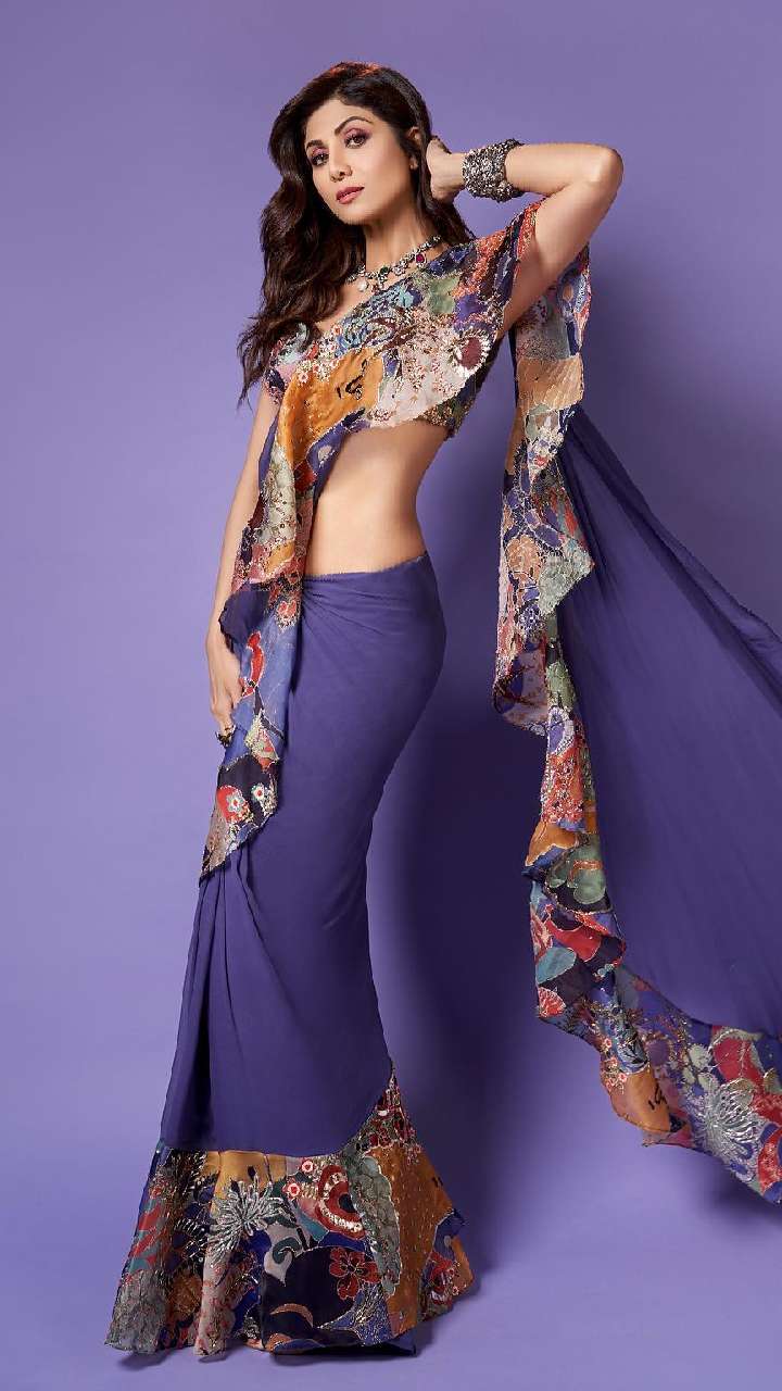 एक्ट्रेस की पर्पल प्रिंटेड बॉर्डर साड़ी आपके लुक में चार चांद लगा देगी। शिल्पा की ये साड़ी काफी डिफरेंट लुक दे रही है।