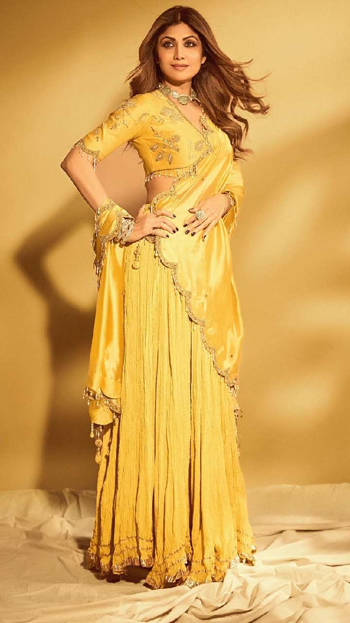 Shilpa ने येलो लहंगे को क्लासी लुक देने के लिए दुपट्टे को स्टाइलिश तरीके से पहना है। एक्ट्रेस का हेयर स्टाइल लुक को अट्रैक्टिव बना रहा है।
