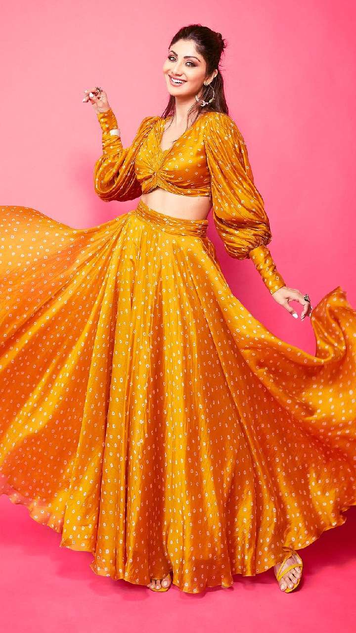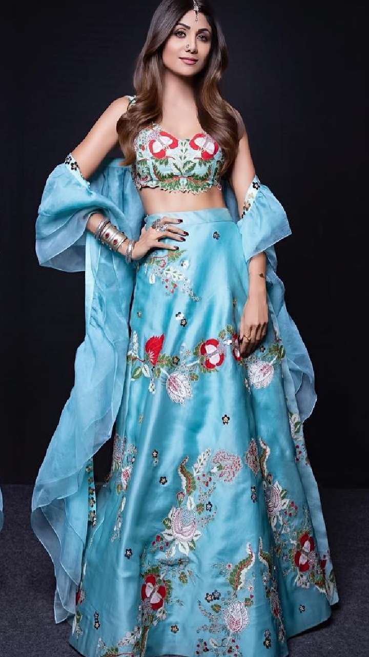 शिल्पा शेट्टी का ये लाइट कलर लहंगा कट स्लीव्स साटन चोली लुक भी बेहद गॉर्जियस है। आप इसे अपना करवाचौथ लुक बना सकती हैं।