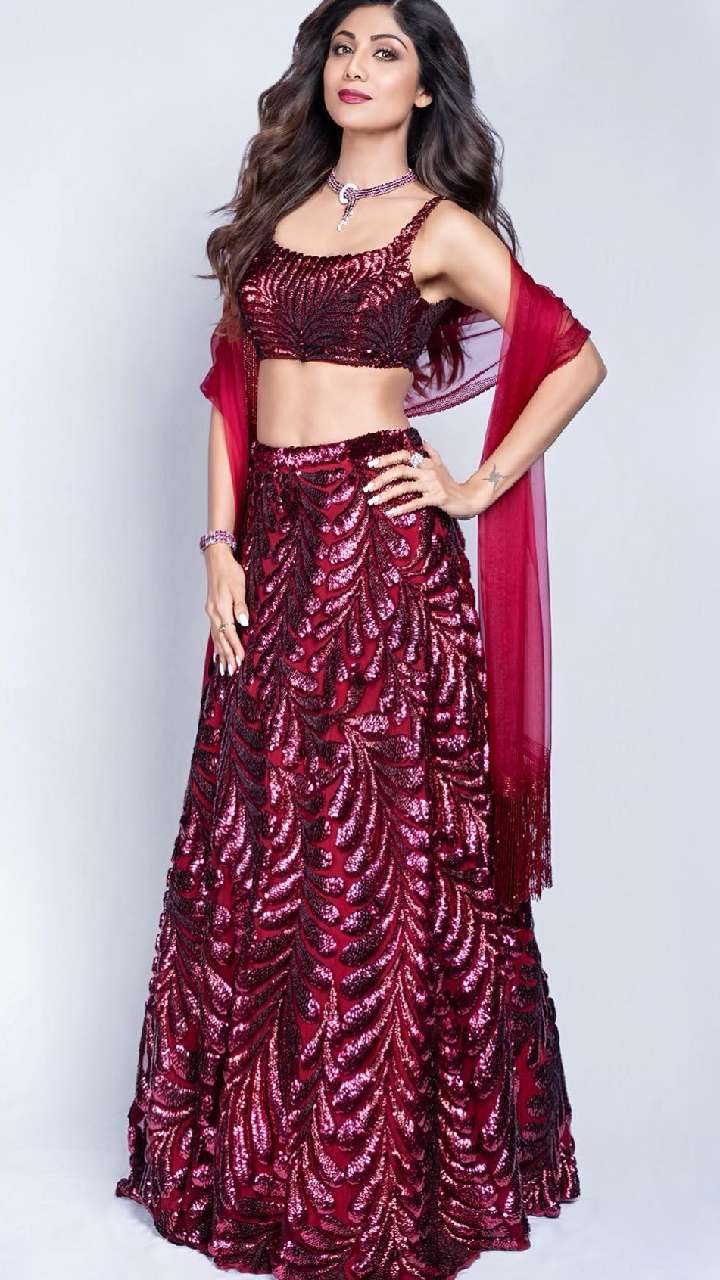 इस करवाचौथ नई नवेली दुल्हन शिल्पा के इस शिमरी मरून रंग के लहंगे को ट्राई कर अपने लुक में चार चांद लगा सकती हैं।