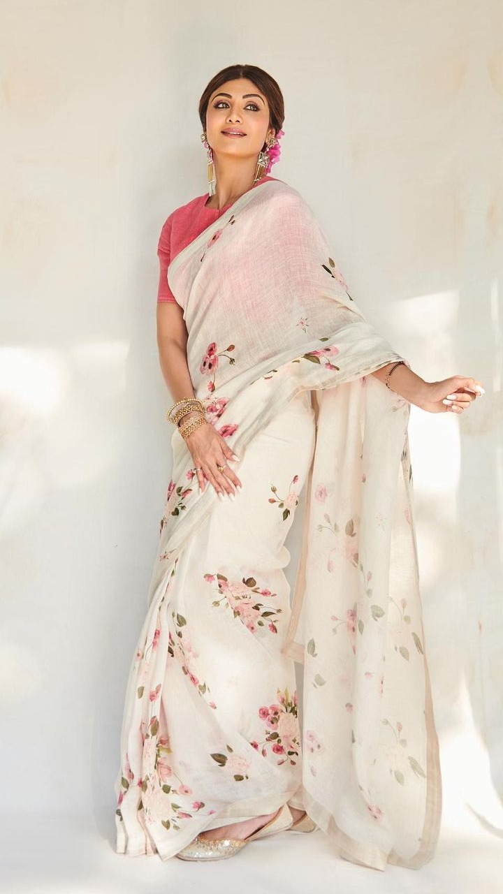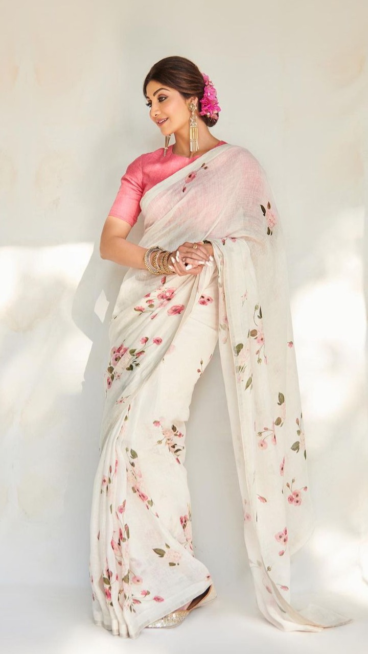 शिल्पा शेट्टी ने हाल ही में अपना ये व्हाइट कलर की फ्लोरल प्रिंट साड़ी में खूबसूरत लुक शेयर किया है।