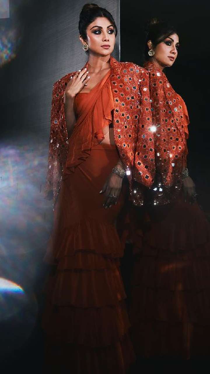 शिल्पा ने इस शिमरी साड़ी को मरमेड स्टाइल में ड्रेप किया है।