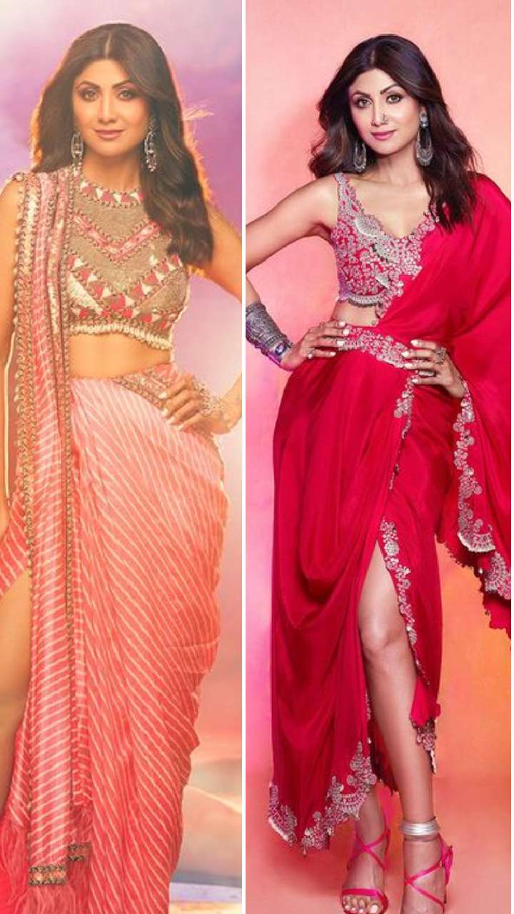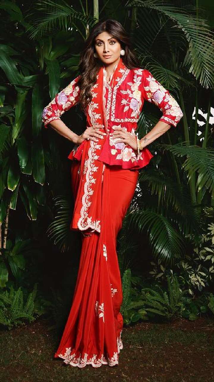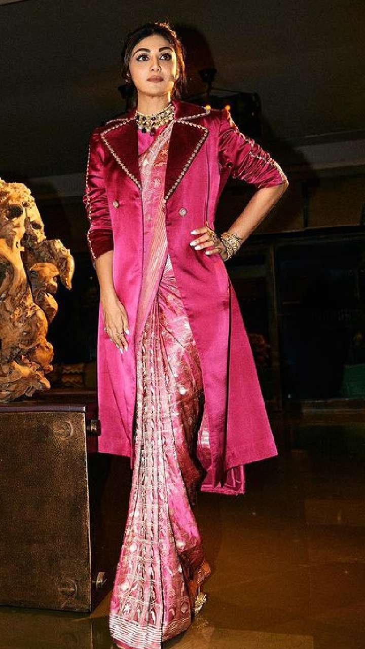 शिल्पा का ये इंडो वेस्टर्न साड़ी को फ्रंट पल्लू स्टाइल में ड्रेप करने का तरीका काफी स्टाइलिश है।