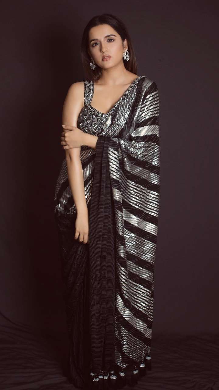 ब्लैक कलर की शिमरी साड़ी में शर्ली सेतिया का ये लुक पार्टीज के लिए बिल्कुल परफेक्ट है।