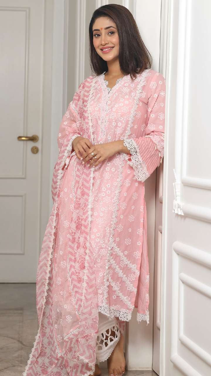 एक्ट्रेस ने खूले बालों के साथ इस पिंक सूट को स्टाइल किया है, जो बेहद एलिगेंट लुक दे रहा हैं। आप इसे राखी पर न्यूड मेकअप के साथ पहनकर कैरी कर सकती हैं।
