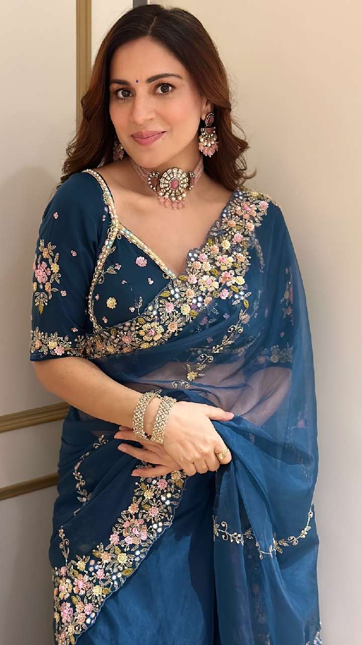 एक्ट्रेस ने लाइट ब्लू कलर की साड़ी पर खूबसूरत नेकलेस कैरी किया है, जिसमें वह काफी स्टाइलिश लग रही हैं। इस लुक को आप अपनी बचपन की सहेली की शादी में स्टाइल कर सकती हैं।