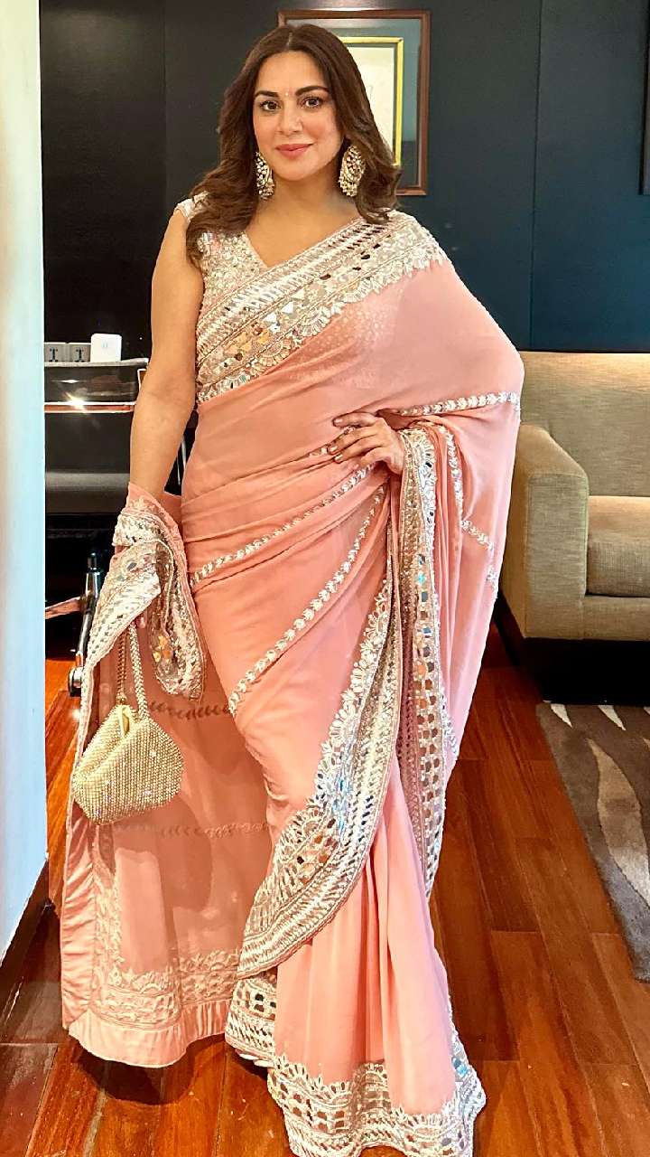 इस साड़ी का कलर काफी अट्रैक्टिव है। साथ ही, एक्ट्रेस के हैंडबैग ने साड़ी को रॉयल लुक दिया है। आप इस साड़ी के साथ डिजाइनर टाइट बन हेयर स्टाइल बनाकर स्टाइलिश दिख सकती हैं।
