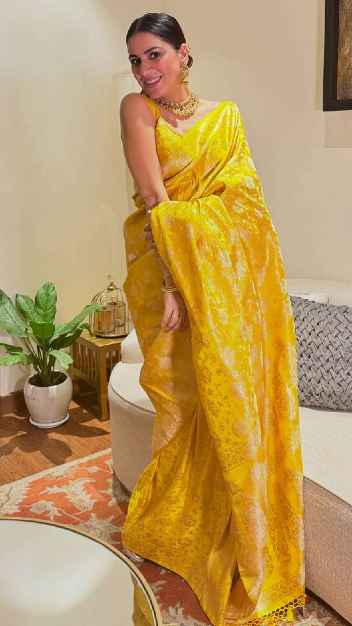 ससुराल में रॉयल दिखने के लिए आप इस येलो कलर की बनारसी सिल्क साड़ी को चुनें। इस तरह की साड़ी लुक को खूबसूरत बना देती हैं। इन्हें आप अपने वॉडरोब में जरूर शामिल करें।