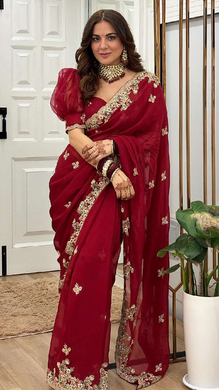 शादी के बाद दुल्हन इस तरह की रेड हैवी वर्क साड़ी चुन सकती हैं। घर के किसी भी फंक्शन में आप इस साड़ी को पहनकर पतिदेव का दिल जीत सकती हैं। लुक को और स्टाइलिश बनाने के लिए आप पफ स्लीव्स ब्लाउज सिलवा सकती हैं।