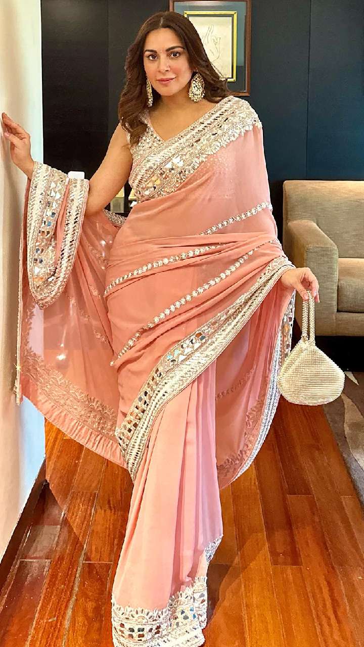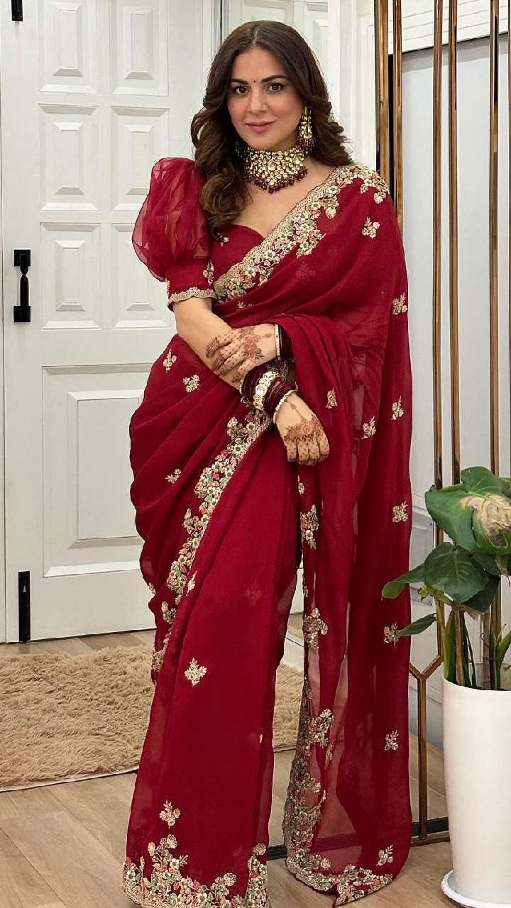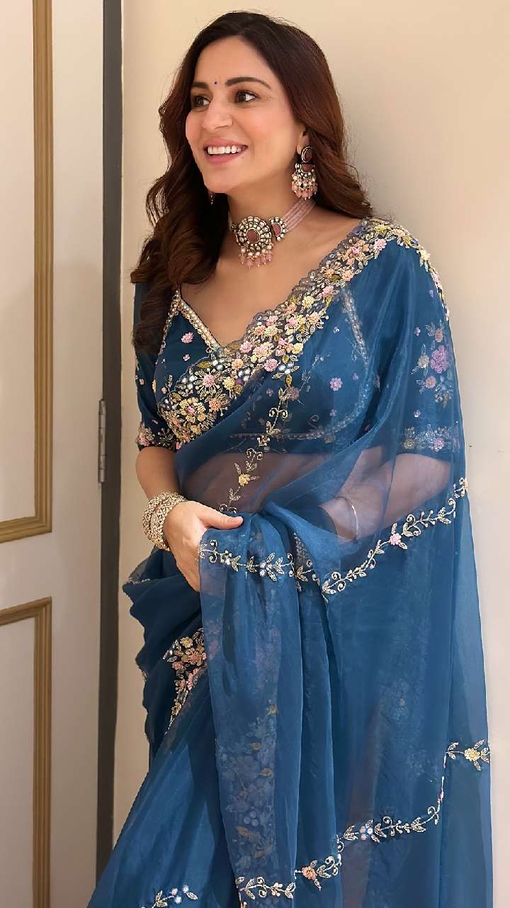 अगर आप लाइट शेड में साड़ी पहनना पसंद करती हैं, तो श्रद्धा आर्या की तरह ऐसी साड़ी पहन सकती हैं। एक्ट्रेस ने लाइट कॉपी कलर जिम्मी चू साड़ी के साथ मिरर वर्क ब्लाउज कैरी किया है। इस साड़ी को पहनकर पतिदेव के आगे जाएंगे, तो वो आप पर फिदा हो जाएंगे।