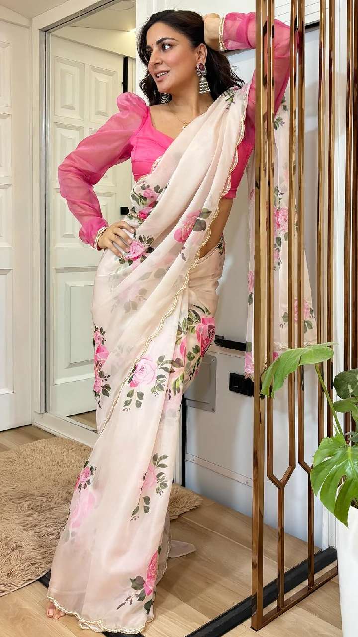 फ्लावर प्रिंटेड साड़ी आजकल काफी ज्यादा ट्रेंड में है। आप भी श्रद्धा आर्या के इस लुक से इंस्पिरेशन ले सकती हैं। इसके साथ आप फुल स्वीक का डिजाइनर ब्लाउज कैरी कर सकती हैं।