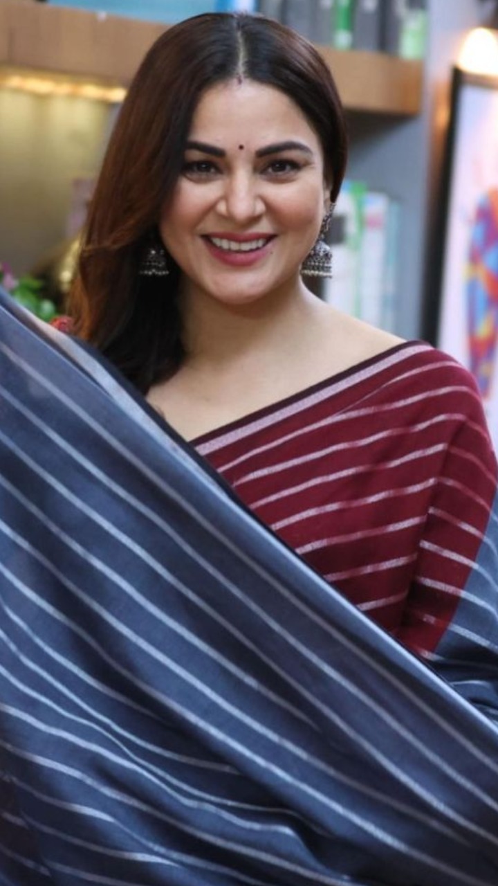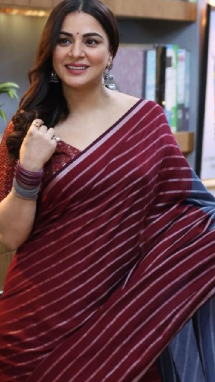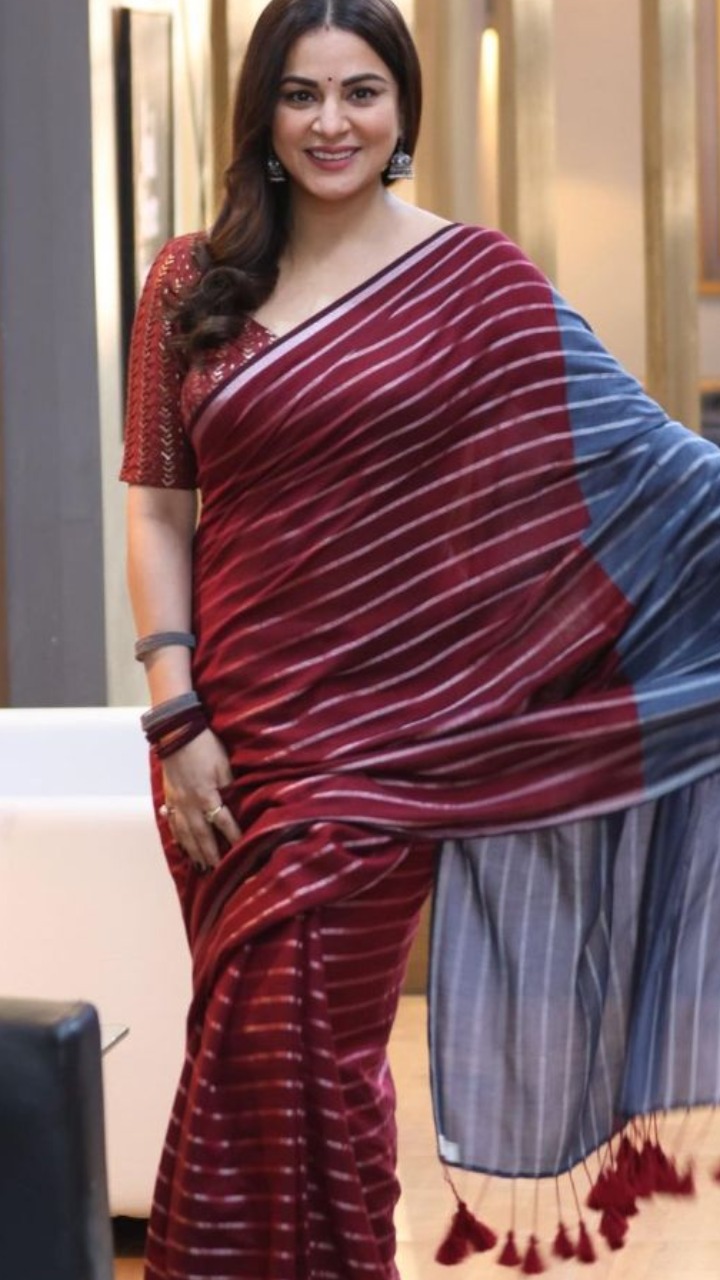 श्रद्धा इस लाइनिंग प्रिंट महरून साड़ी में बेहद गॉर्जियस दिख रही हैं।