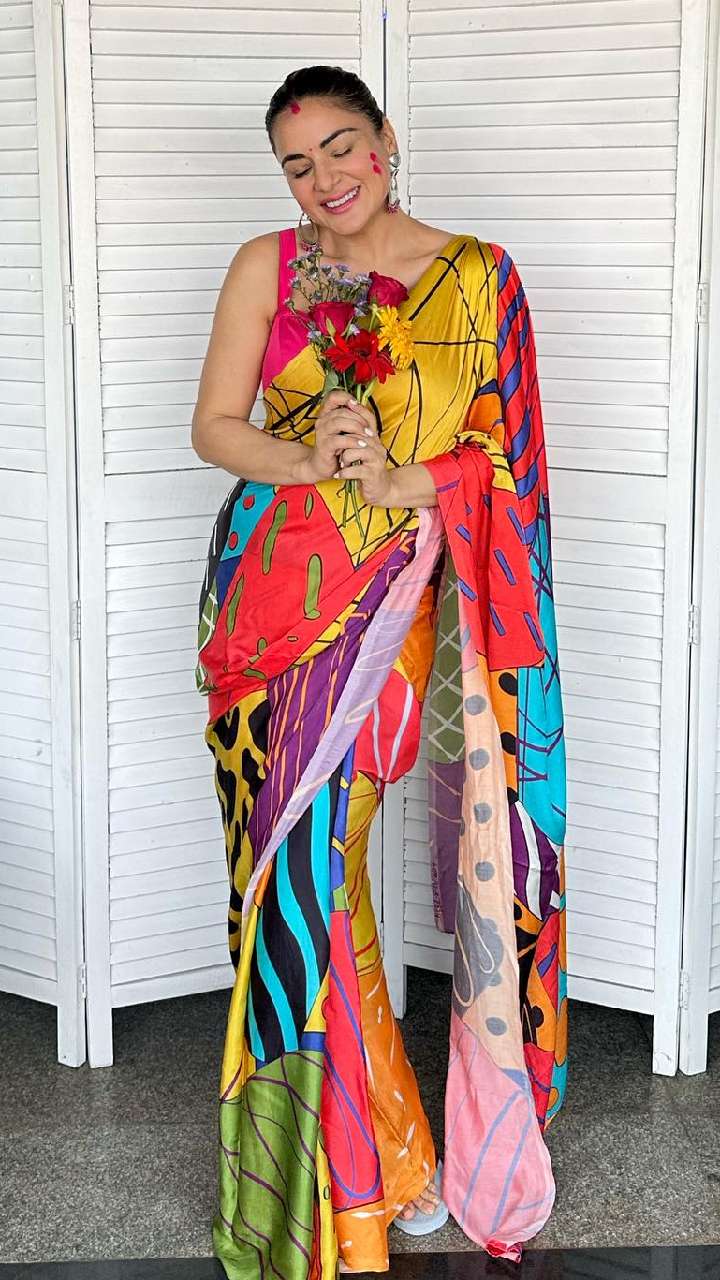 मल्टी कलर साड़ी में श्रद्धा आर्या का लुक काफी डिफरेंट लग रहा है। आप मानसून के सीजन में इस तरह की साड़ी को स्टाइल करें।