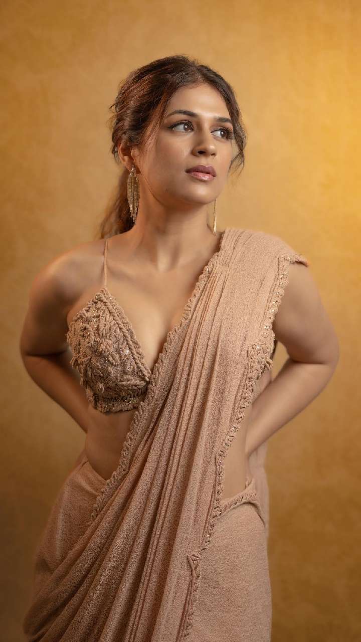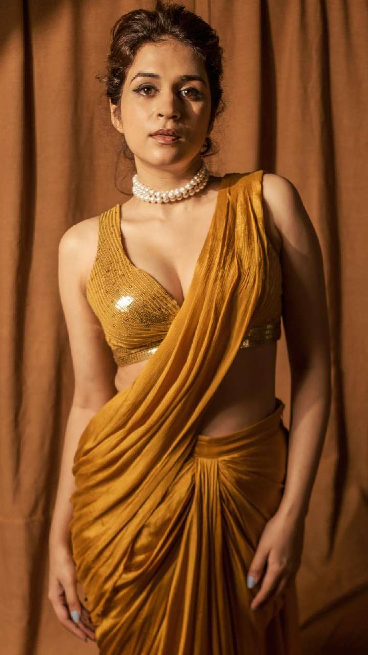 अभिनेत्री ने प्लेन साटन साड़ी के साथ सेक्विन बिकिनी कट ब्लाउज से खुद को हॉट बनाया हुआ है।