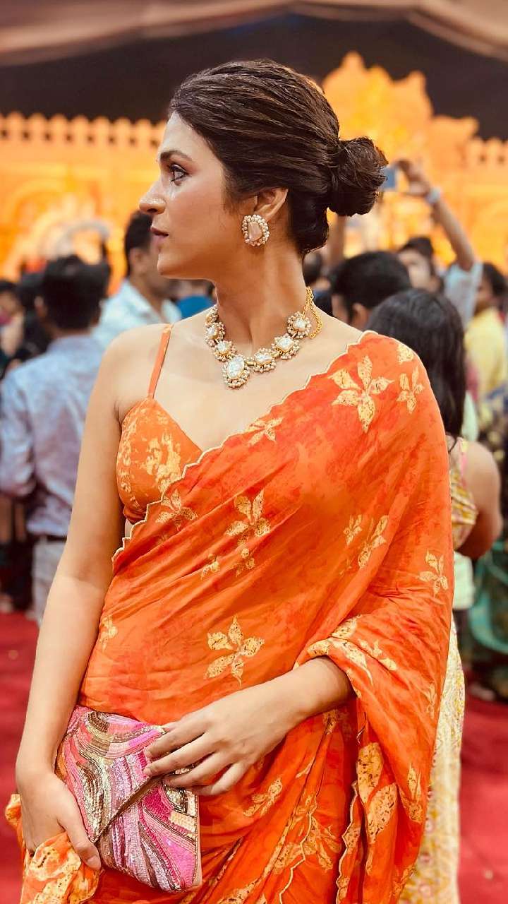 श्रद्धा दास का प्रिंटेड ऑरेंज साड़ी के साथ स्ट्रैपी ब्लाउज डिजाइन काफी किलर लुक दे रहा है।