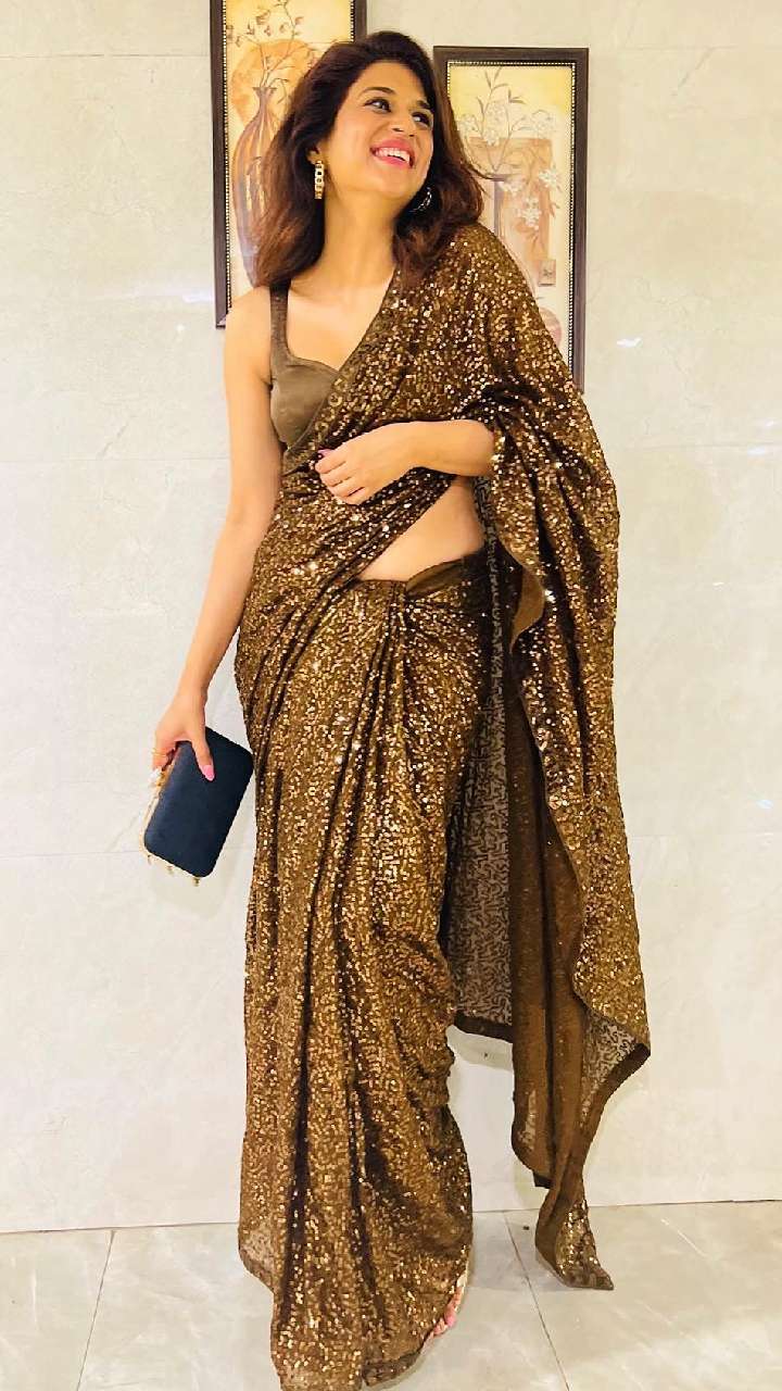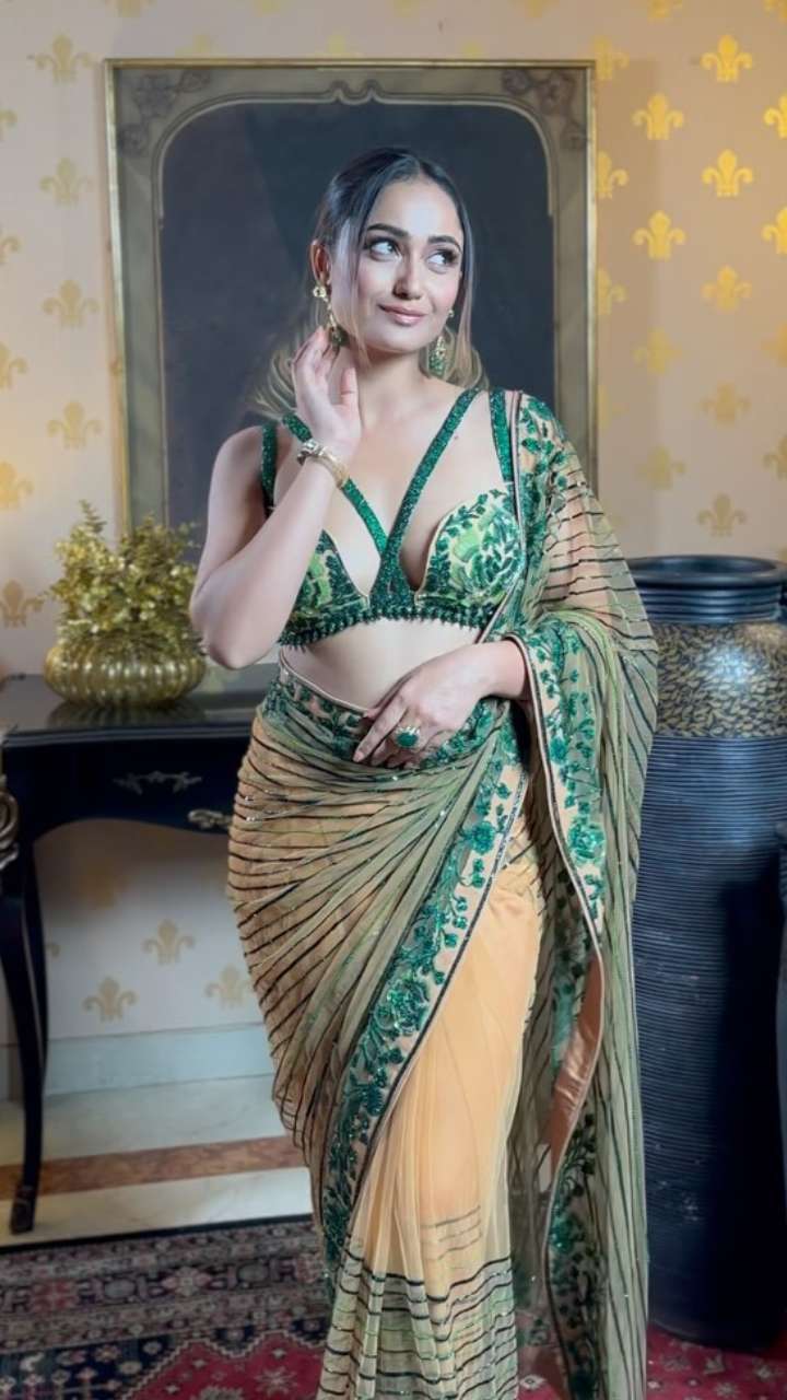 इस मल्टीकलर शिमरी साड़ी नूडल स्ट्रैप ब्लाउज में अभिनेत्री कहर ढहा रही हैं। ये लुक यंग गर्ल्स के लुक में जान डाल देगा।