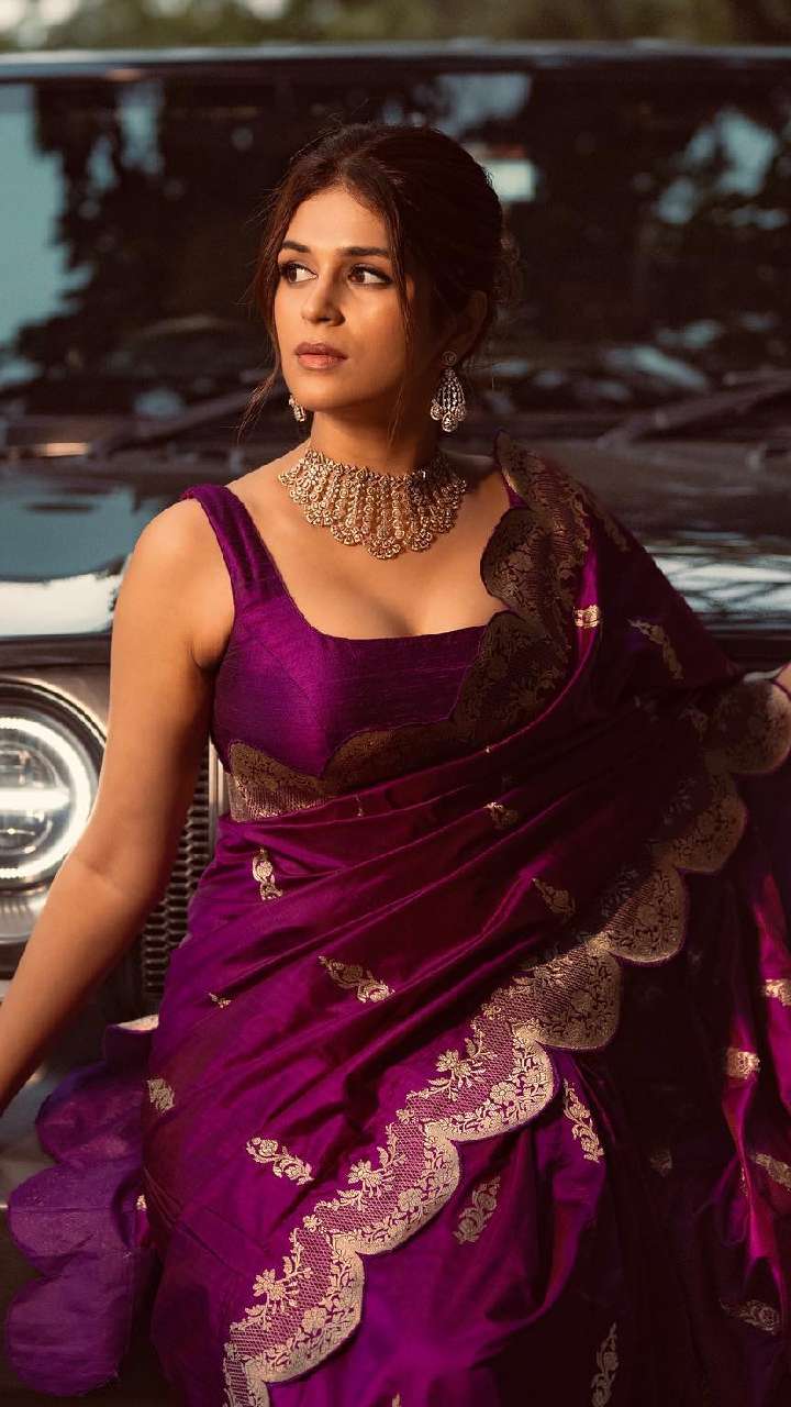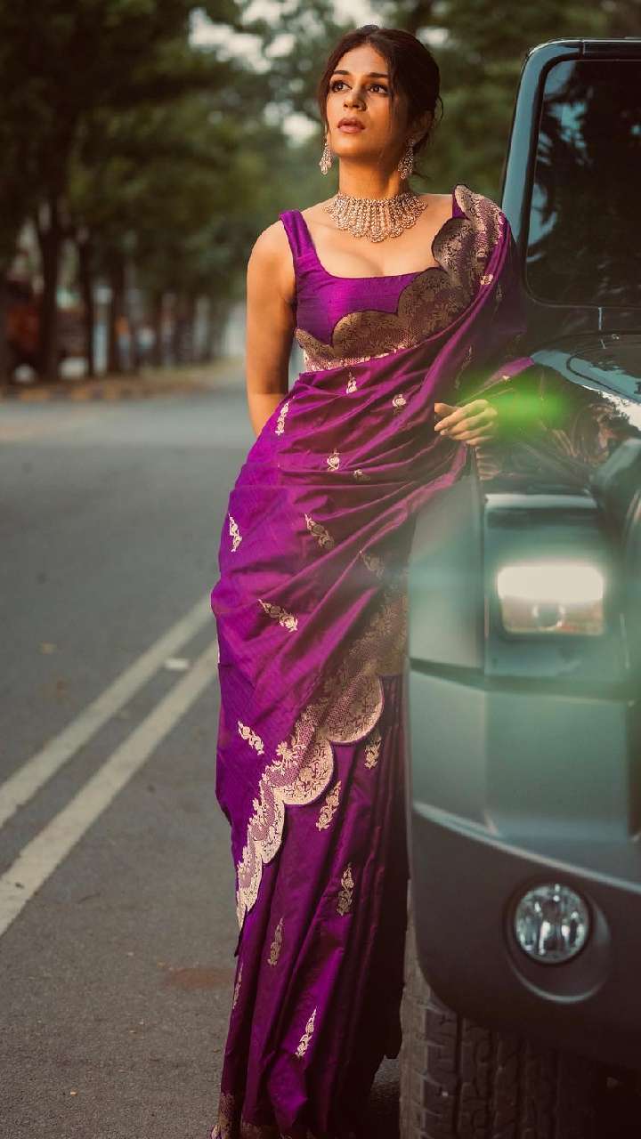 श्रद्धा दास ने इंस्टाग्राम पर पर्पल कलर की जरी वर्क साडी में अपना गॉर्जियस लुक शेयर किया है। इसके साथ एक्ट्रेस डीपनैक ब्लाउज लुक किलर है।