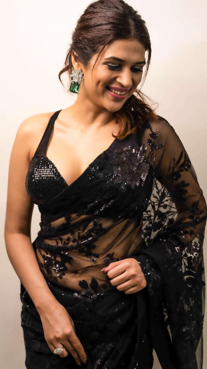 इस ब्लैक कलर की ट्रांसपेरेंट साड़ी में एक्ट्रेस काफी गॉर्जियस नजर आ रही हैं। इसके साथ कट स्लीव्स ब्लाउज लुक बेस्ट है।