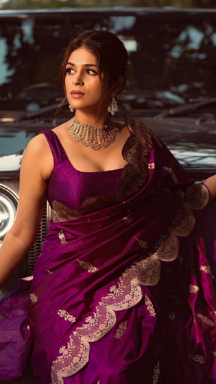 पर्पल साड़ी में श्रद्धा दास बहुत खूबसूरत दिख रहीं हैं। एक्ट्रेस का ये पूरा लुक त्योहार के लिए परफेक्ट है।