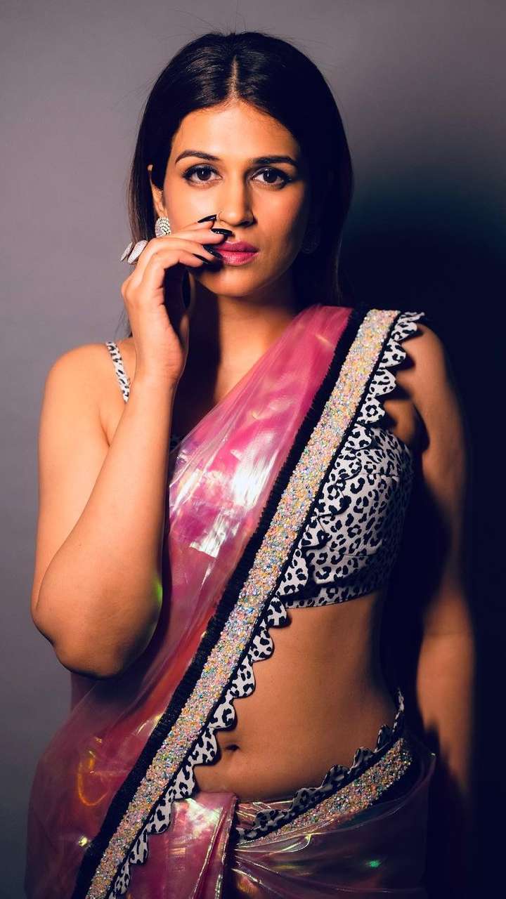 श्रद्धा दास का ये शाइनी साड़ी संग एनिमल प्रिंट स्ट्रेप ब्लाउज लुक भी हॉट है।